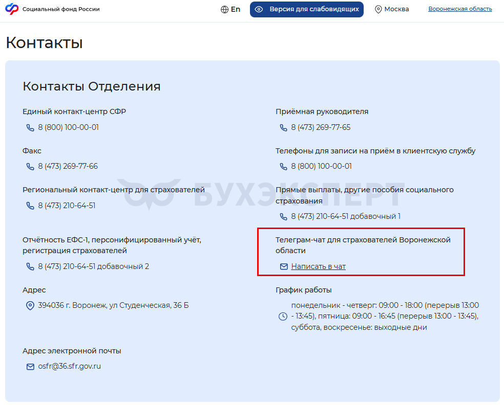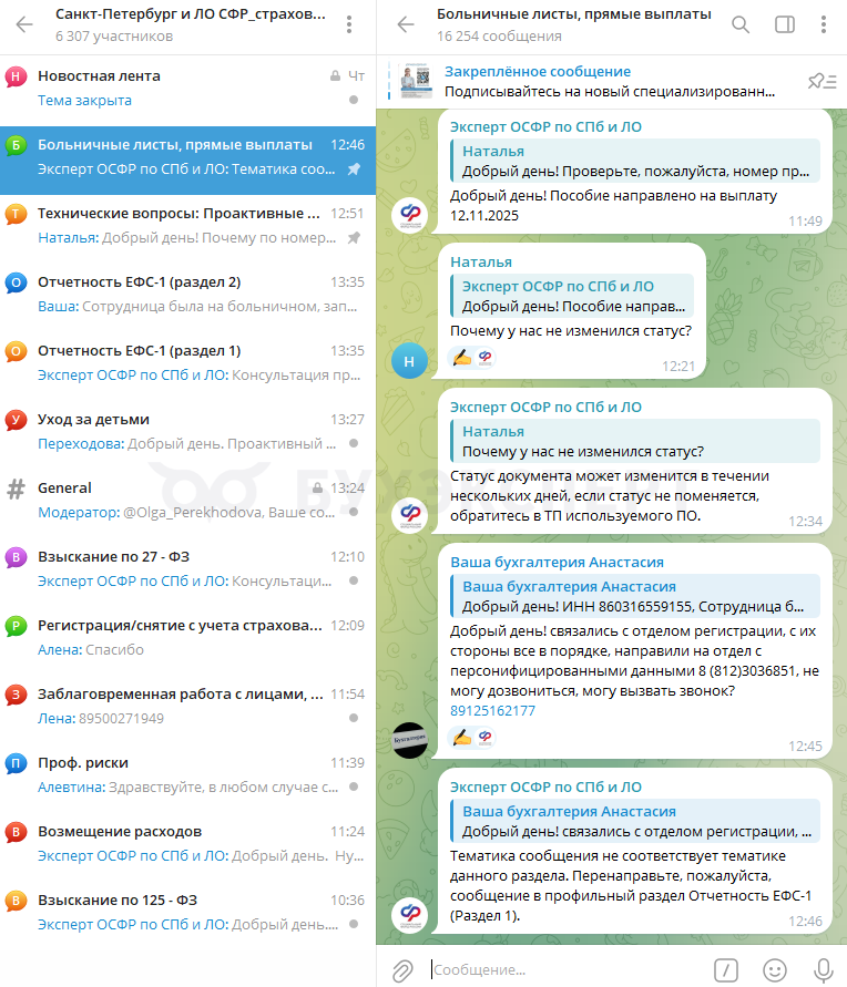 Здесь можно узнать новости местного отделения, а также оперативно проконсультироваться. Чат разделили по темам: больничные листы, технические вопросы, отчетность и т. д. Вопросы задаем в соответствующем разделе чата.