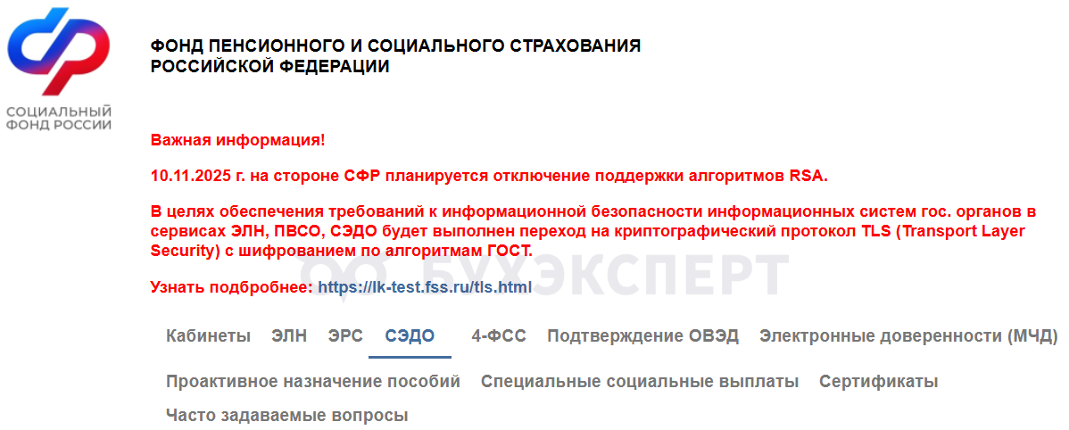 В ноябре 2025 года СФР подключил новый криптографический протокол ТLS c шифрованием по алгоритмам ГОСТ. Изменения затронули в том числе обмен электронными документами по СЭДО.