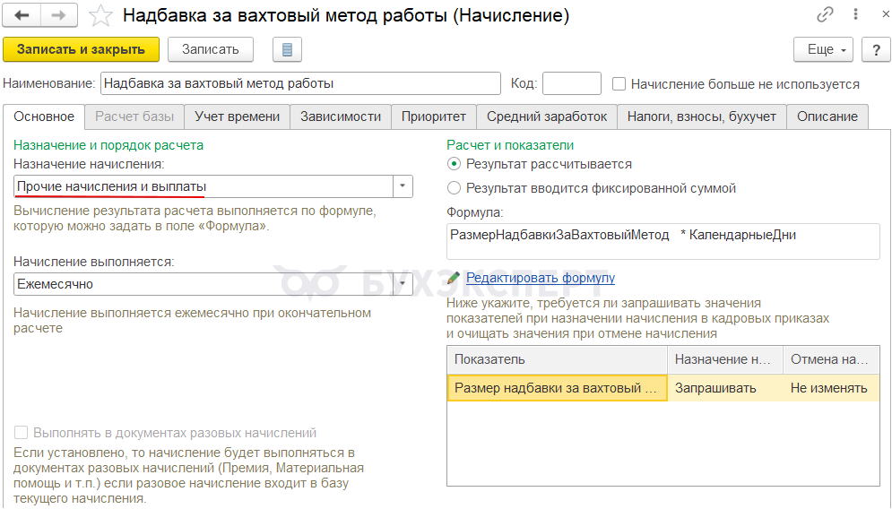 В ЗУП 3.1 для расчета надбавки за вахтовый метод работы понадобится самостоятельно создать отдельное начисление (Настройка – Начисления). Если мы хотим включить надбавку в расчет среднего заработка – в настройках начисления на вкладке Основное выбираем назначение начисления Прочие начисления и выплаты.