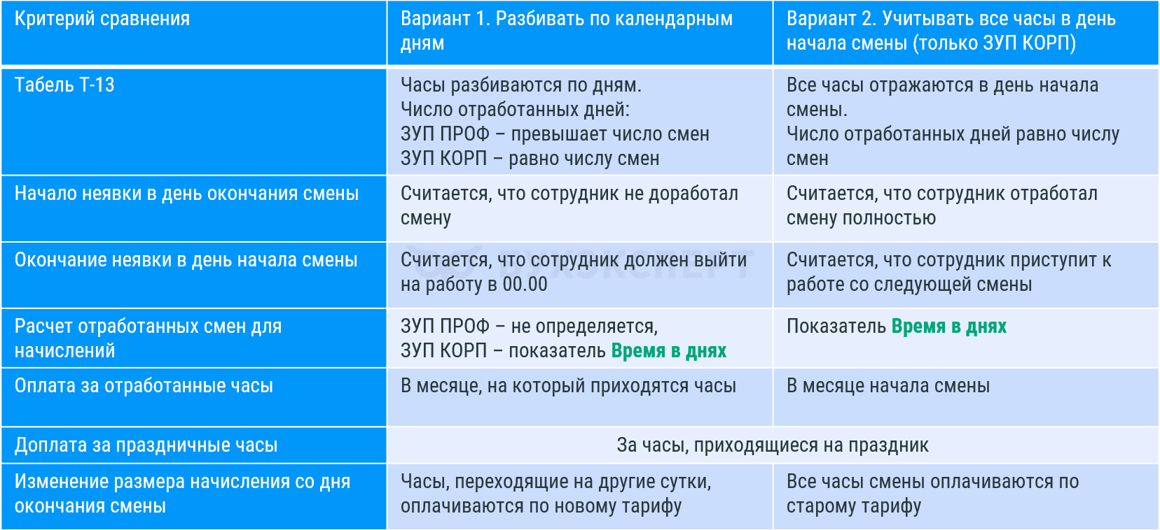 Сравнение двух вариантов учета переходящих смен приведено в таблице.