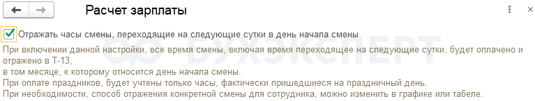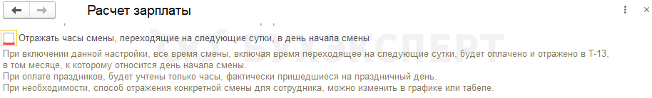 В ЗУП КОРП вариант, который будет использоваться по умолчанию, выбираем в настройках расчета зарплаты. За это отвечает флажок Отражать часы смены, переходящие на следующие сутки в день начала смены