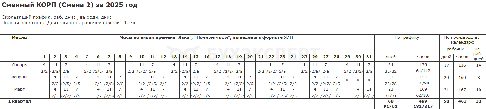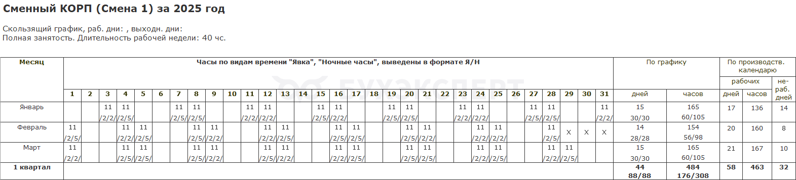 Создадим График работы, используя учет режимов и смен. В результате в графике автоматически отразился учет всех переходящих смен в день начала смены.