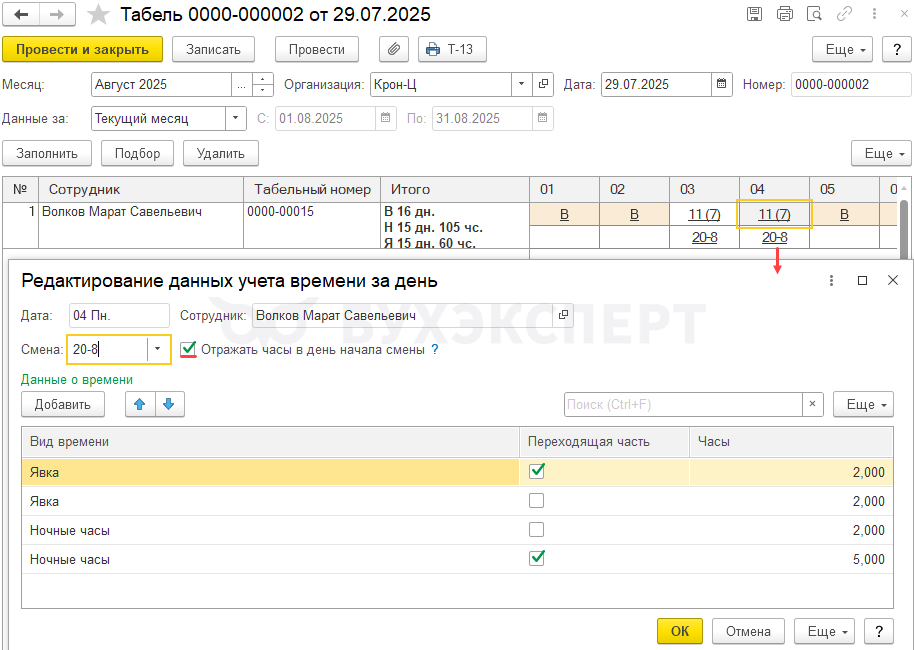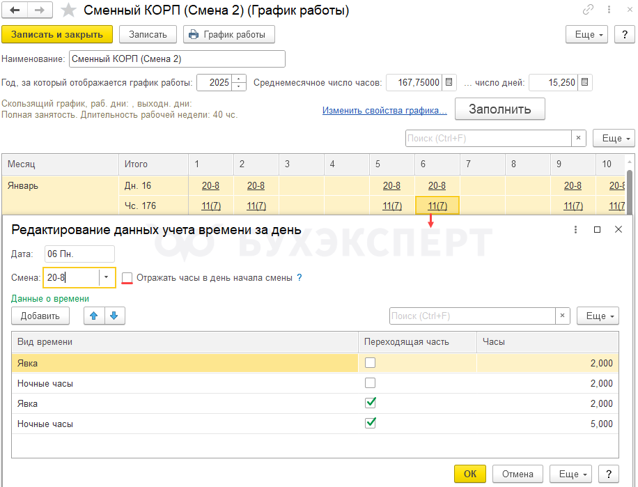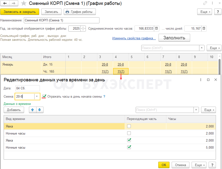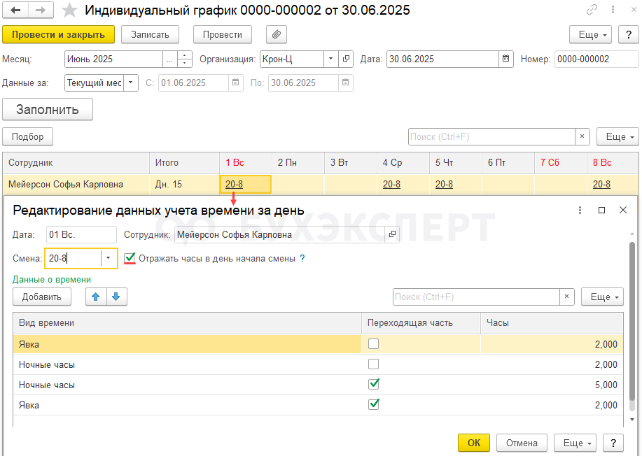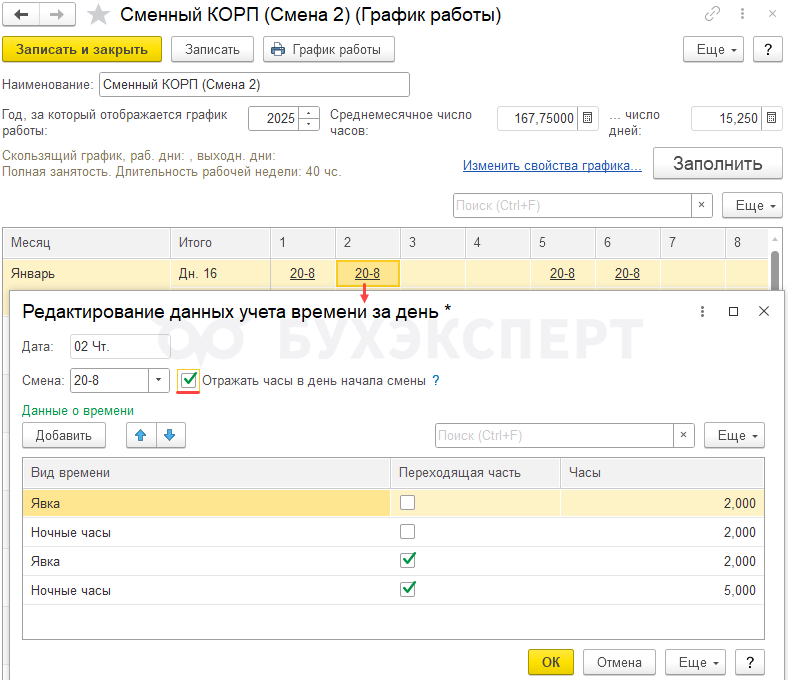 Для проверки можем открыть в документе График работы форму Редактирование данных учета времени за день и убедимся, что для переходящих смен установлен флажок Отражать часы в день начала смены.