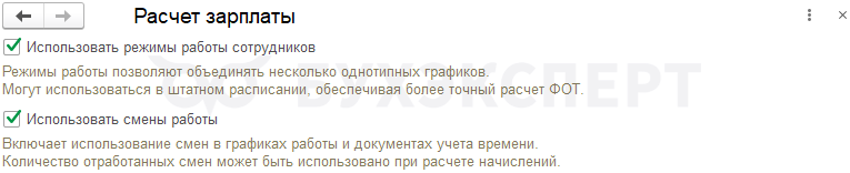 - Проверить подключена ли возможность использования режимов работы и смен. За это отвечают флажки Использовать режимы работы сотрудников и Использовать смены работы. Если флажки не установлены, то поставим их