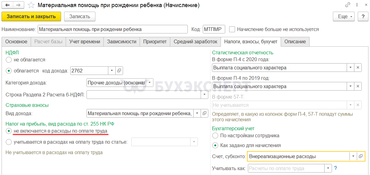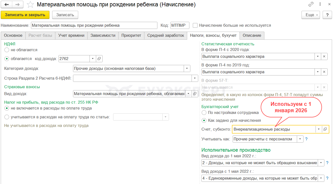 С 2026 года можно включать детскую мат. помощь в расходы при расчете налога на прибыль. Поэтому теперь нужно изменить способ отражения в настройках начисления. Материальную помощь при рождении ребенка разрешили учитывать, как внереализационные расходы — это означает, что отражать ее в проводках, как обычную зарплату, не получится. Поэтому лучше создать новый способ отражения для внереализационных расходов и указать его в настройках начисления. Если ранее настраивали такой способ отражения для других начислений, можно оставить его.