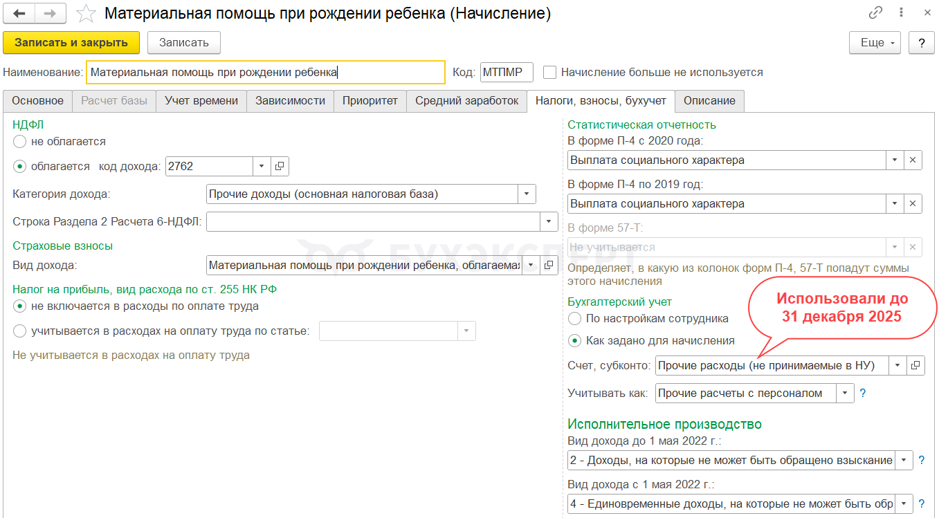 Несмотря на то, что с 2026 года изменили способ отражения в настройках начисления в ЗУП 3.1, переключатель вида расхода в НУ оставляем, как и раньше — в положении Не включается в расходы по оплате труда. Это связано в тем, что хоть детскую мат. помощь теперь и включаем в расходы, она проходит для целей НУ не как оплата труда, а как прочий расход.