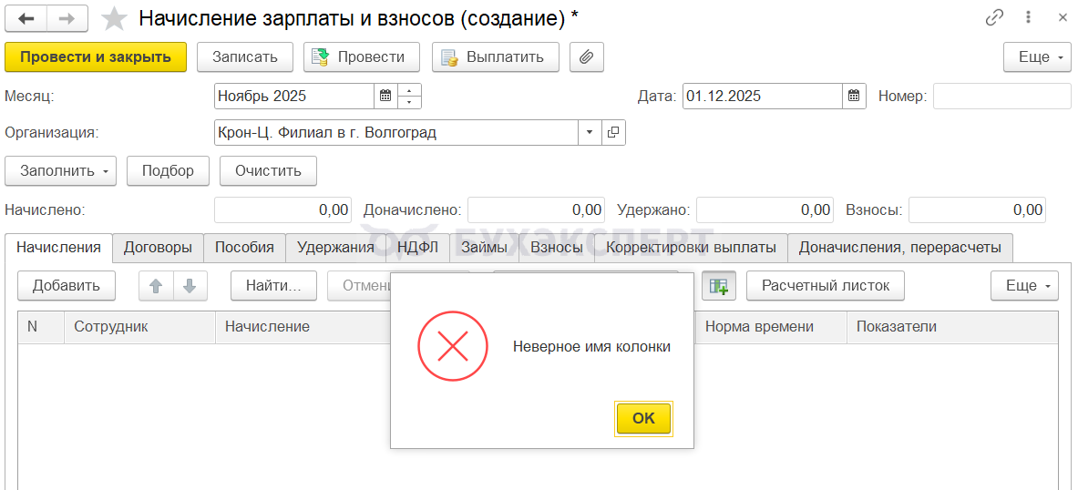 В ЗУП 3.1 появилась ошибка – при попытке заполнить документы Начисление за первую половину месяца и Начисление зарплаты и взносов появляется сообщение «Неверное имя колонки» и документ не заполняется.