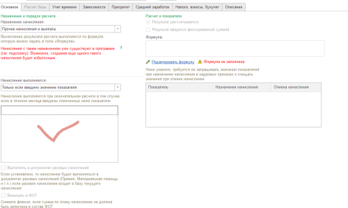 Чтобы программа вела себя именно так, в настройках вида начисления указывается, что начисление выполняется Только если введено значение показателя и чуть ниже ставится флажок напротив этого показателя: