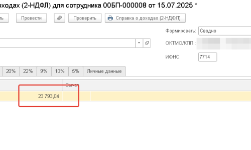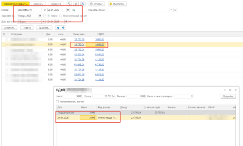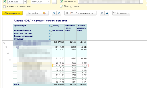 Но вот по сотруднику начислен аванс 23 793,04, НДФЛ 3 093. В Анализ по НДФЛ сумма по документу заполняется в три раза больше по зарплате и НДФЛ. В 6-НДФЛ сумма начислений заполняется верная, а НДФЛ в три раза больше. При чем проблема только по одному сотруднику.