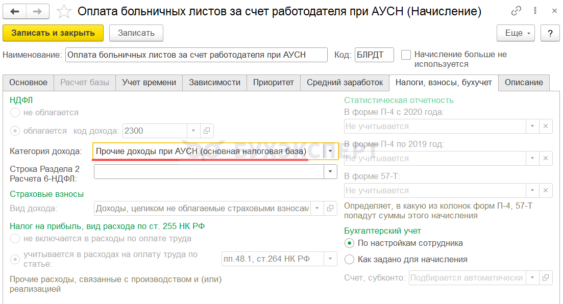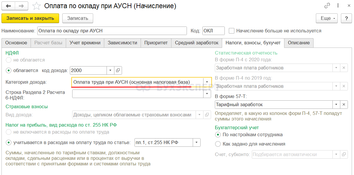 Спасибо за ваш комментарий, добавили в статью информацию по категориям дохода. Всего в ЗУП их три — Оплата труда при АУСН (основная налоговая база), Прочие доходы при АУСН (основная налоговая база) и Районные, северные надбавки при АУСН .