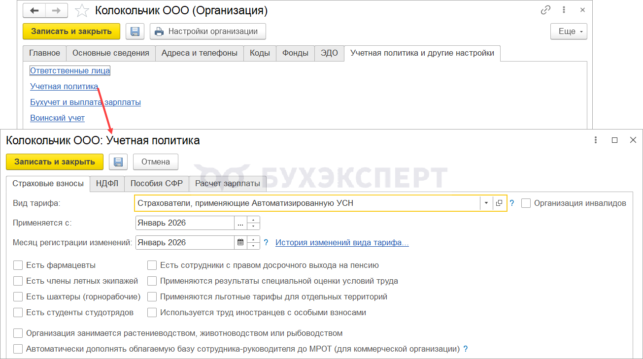 В целях учета взносов для организаций, которые применяют режим АУСН, в настройках учетной политики (Настройка — Организации (или Реквизиты организации) — Учетная политика и другие настройки — Учетная политика) на складке Страховые взносы устанавливаем вид тарифа страховых взносов Страхователи, применяющие Автоматизированную УСН.