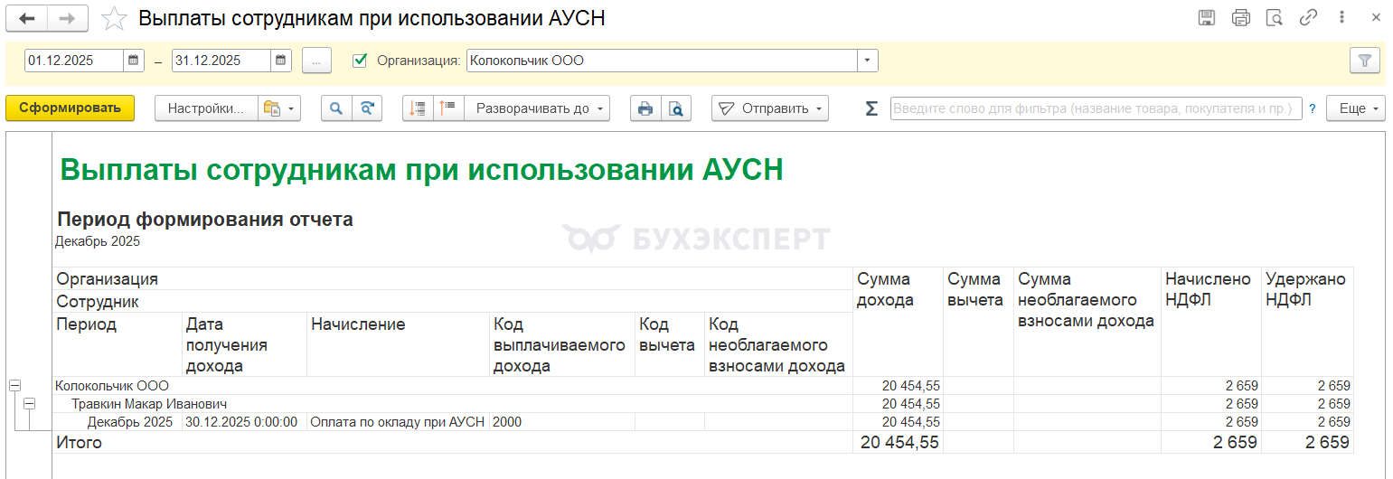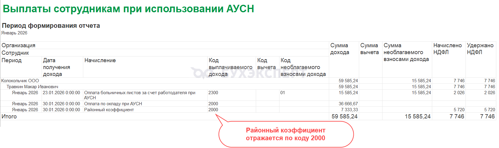 ФНС в письме от 26.11.2025 N БС-4-11/10609@ рекомендует работодателям, применяющим АУСН, использовать код 2006 для доходов в виде районных коэффициентов и северных надбавок. В текущих релизах ЗУП 3.1 в отчете Выплаты сотрудникам при использовании АУСН указывается код дохода 2000 вместо 2006.