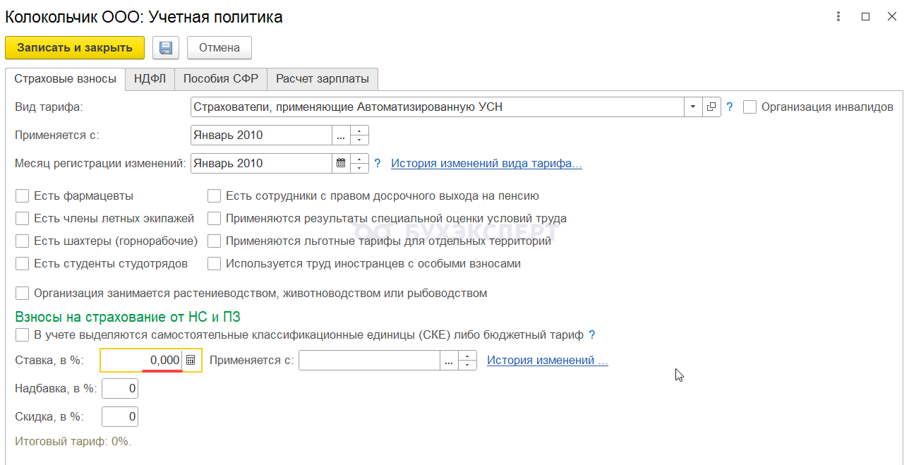 В целях учета взносов для организаций, которые применяют режим АУСН, устанавливаем вид тарифа страховых взносов Страхователи, применяющие Автоматизированную УСН.