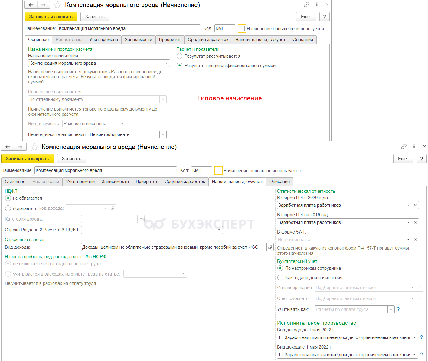 В ЗУП 3.1 для начисления компенсации морального вреда есть типовое начисление Компенсация морального вреда (Настройки – Начисления). По умолчанию оно не облагается НДФЛ и взносами.