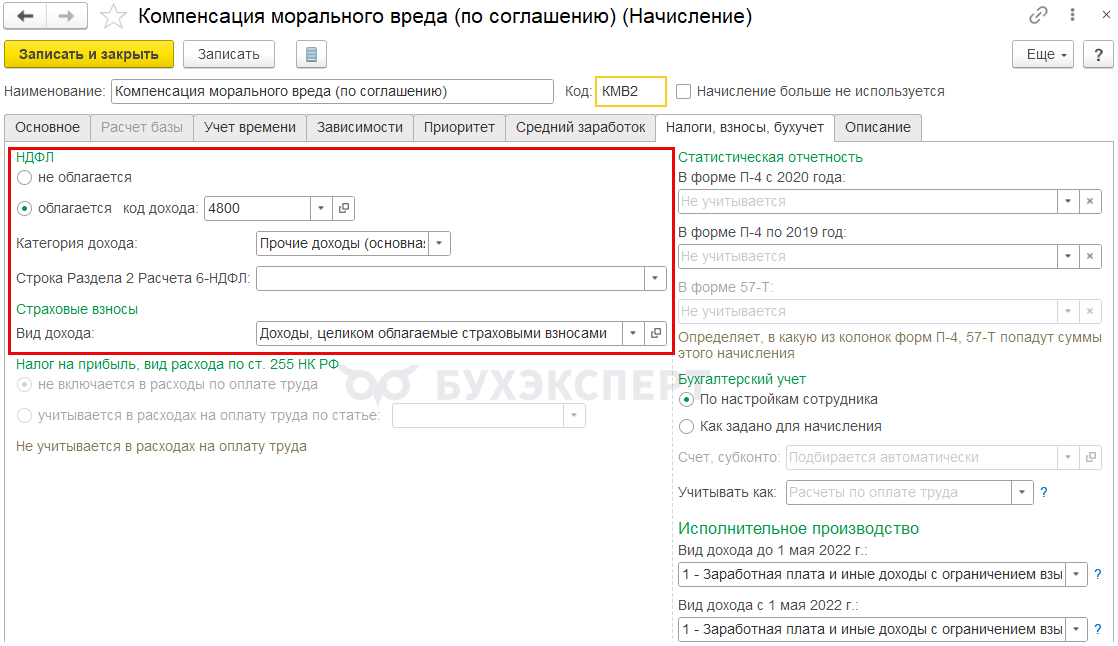 - Чтобы обложить компенсацию морального вреда НДФЛ – в настройках начисления указываем код дохода по НДФЛ и выбираем категорию дохода