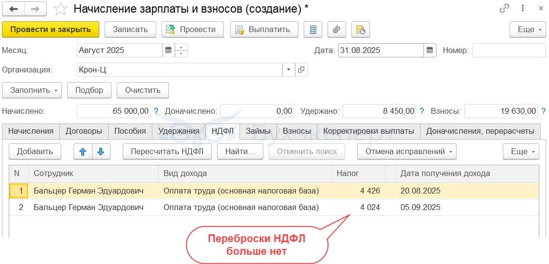 После того, как исправим расчет НДФЛ любым из предложенных способов лишних перерасчетов в документах Начисление зарплаты и взносов больше не будет.