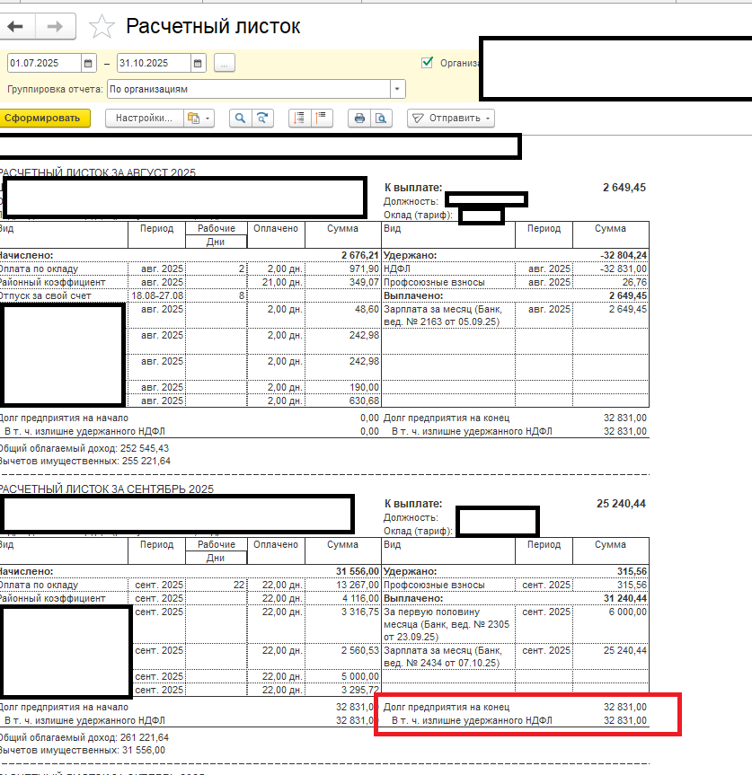 Излишне удержанный НДФЛ можно зачесть в последующих месяцах до окончания налогового периода. Для зачета НДФЛ в ЗУП 3.1 не требуется дополнительных действий. Сумма излишне удержанного НДФЛ будет автоматически учитываться при заполнении Ведомостей: