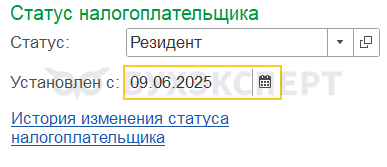 Изменим налоговый статус сотрудника. При приобретении сотрудником резидентства статус налогоплательщика в программе можно устанавливать с даты изменения статуса.