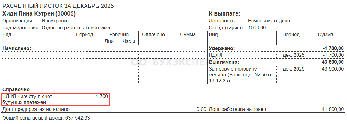 И в расчетном листке сумма Зачтено излишне удержанного НДФЛ равна сумме НДФЛ к зачету.