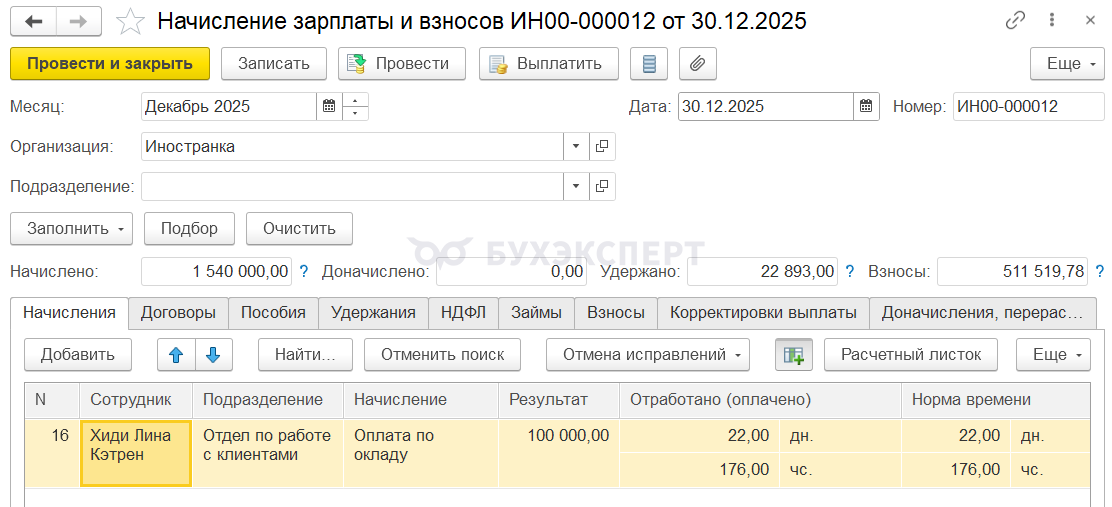 Переходим к зачету НДФЛ с декабрьской зарплаты. Заполним Начисление зарплаты и взносов за декабрь.