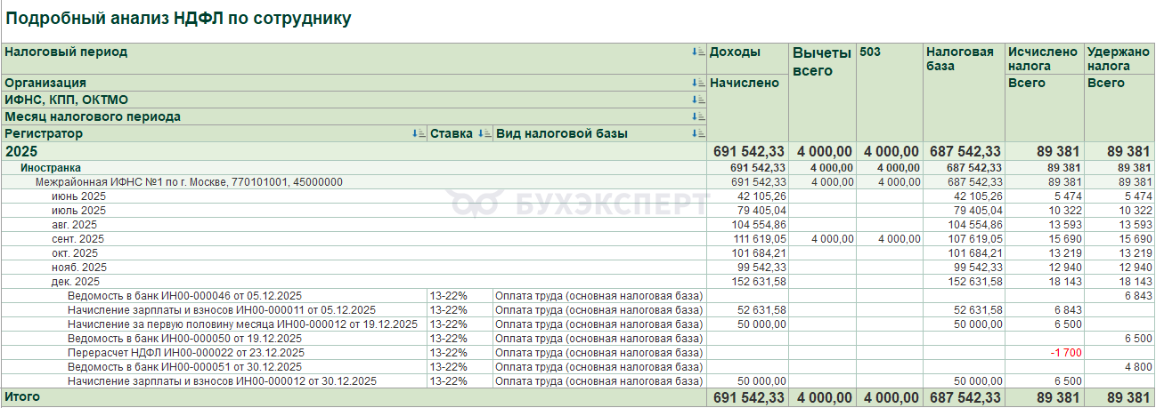 В результате перерасчета НДФЛ по резидентским ставкам с начала года по сотруднику возникает излишне удержанный налог в сумме -42 904 руб.