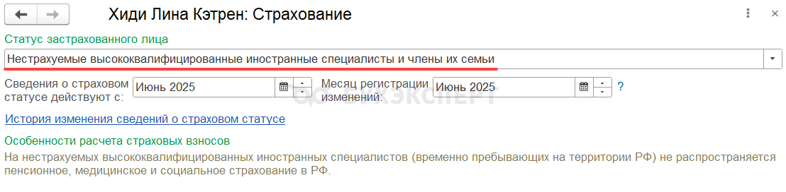 В данном случае программа определит, что сотрудник ВКС, по статусу застрахованного лица. Для этого в карточке сотрудника по ссылке Страхование должен быть указан статус застрахованного лица Нестрахуемые высококвалифицированные иностранные специалисты и члены их семьи.