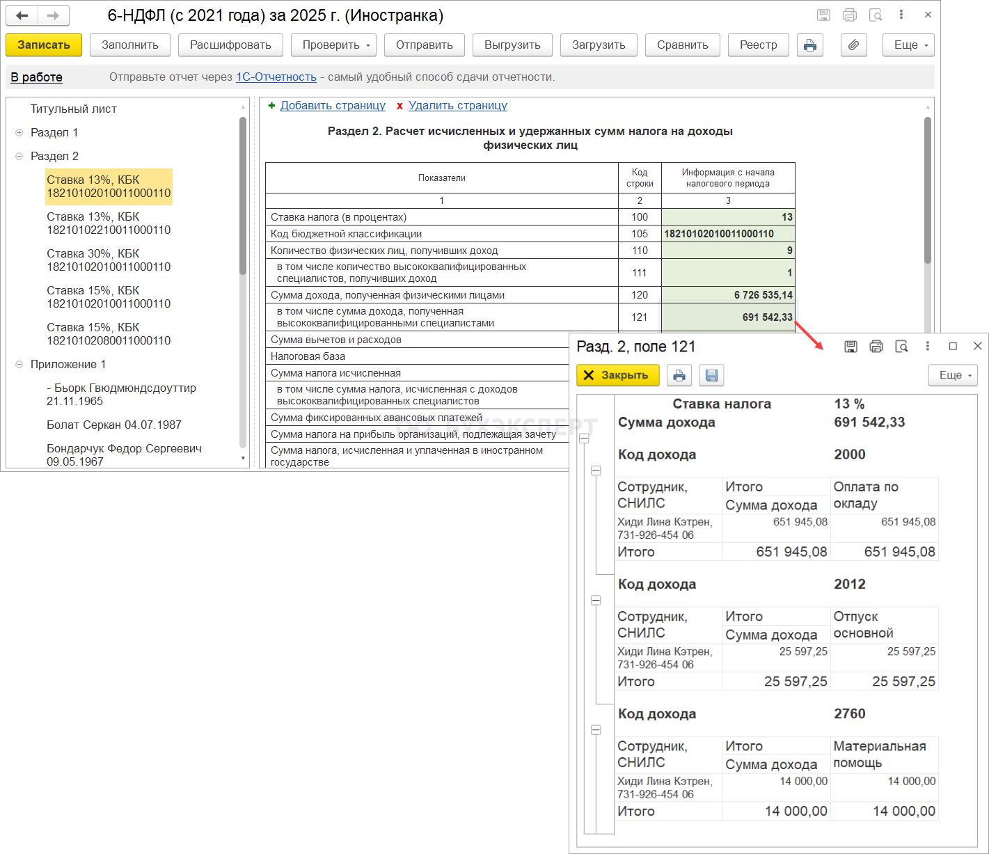 Также в видео нет шага 3, на котором подаем корректировки уведомлений и 6-НДФЛ - этот шаг выполняем, только если в этом есть необходимость. Например, если перерасчет выполняем для сотрудников с РК СН и после перерасчета НДФЛ у них появляются новые КБК по НДФЛ. Например, до смены статуса с нерезидента удерживали НДФЛ по ставке 30% и весь налог отражался по КБК 201 (обычный НДФЛ). Затем после смены статуса часть доходов в виде РК и СН была отнесена к отдельной налоговой базе, расчет НДФЛ с нее выполняется отдельно - Районный коэффициент и северная надбавка в учете НДФЛ с 2025 года. В итоге налог по сотруднику не только пересчитался по ставке 13%, то но и разделился по разным КБК: КБК 201 для НДФЛ с зарплаты и КБК 221 для РК и СН.