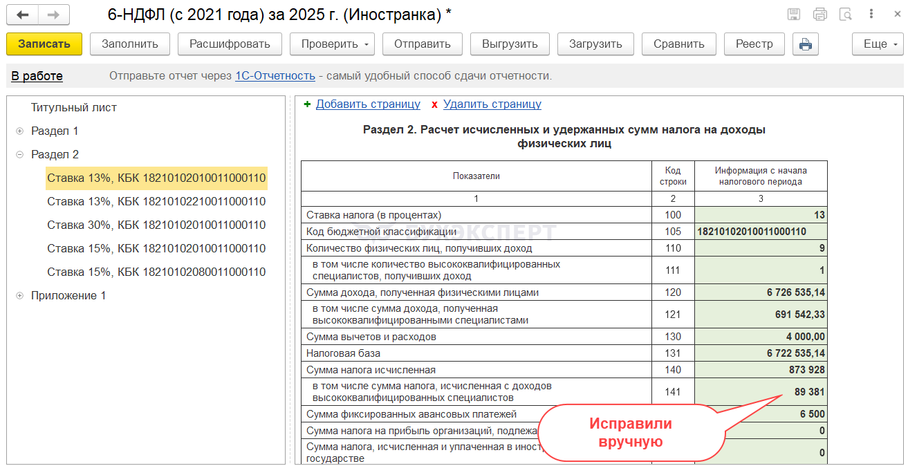 После изменения статуса, корректирующий 6-НДФЛ автоматически заполняется в разрезе налоговых баз по двум КБК. Но чтобы НДФЛ в строку 140 попал верно после перерасчета, дата на титульном листе отчета должна быть равна последнему дню месяца в документе Перерасчет НДФЛ. У нас в перерасчетах выбран месяц Август, значит дата на титульном листе – 31.08.2025. После заполнения отчета дату можно поменять.