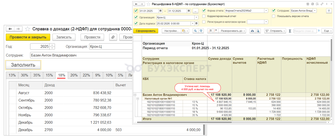 В ЗУП 3.1 есть ошибка – если сотруднику с доходами более 2,4 млн руб. в отчетном периоде выплачивали частично облагаемые доходы (например, мат. помощь) и сумма дохода полностью уложилась в необлагаемый предел, такие доходы по-разному отражаются в 6-НДФЛ и справке для сотрудника.