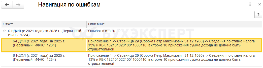Если в Приложении 1 к отчету есть отрицательные доходы, появится список сотрудников с ошибкой.