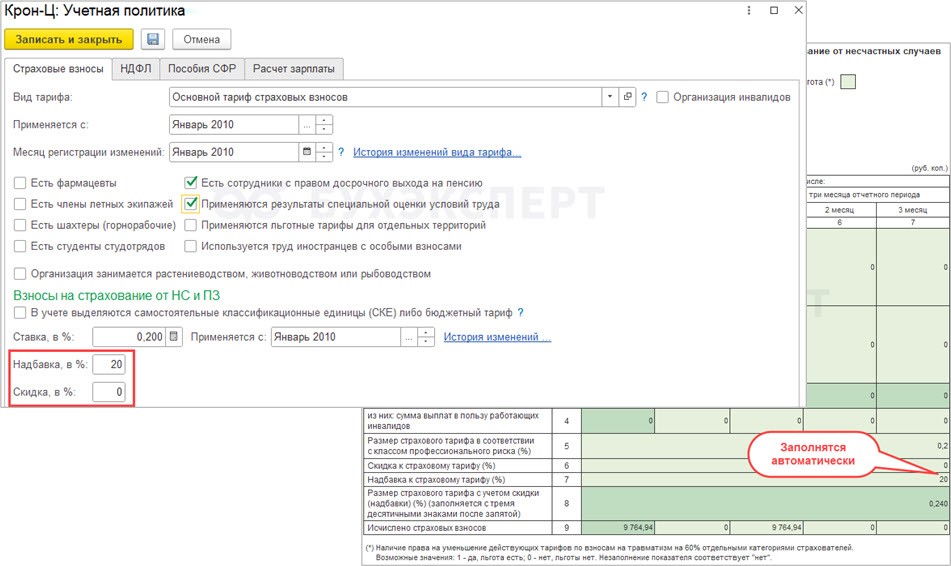 Тариф страховых взносов для СКЕ указываем без учета надбавки или скидки. Если скидка или надбавка установлена для организации в целом и для СКЕ указать тариф с учетом этой же скидки (надбавки), при расчете взносов для СКЕ эта скидка или надбавка задвоится.