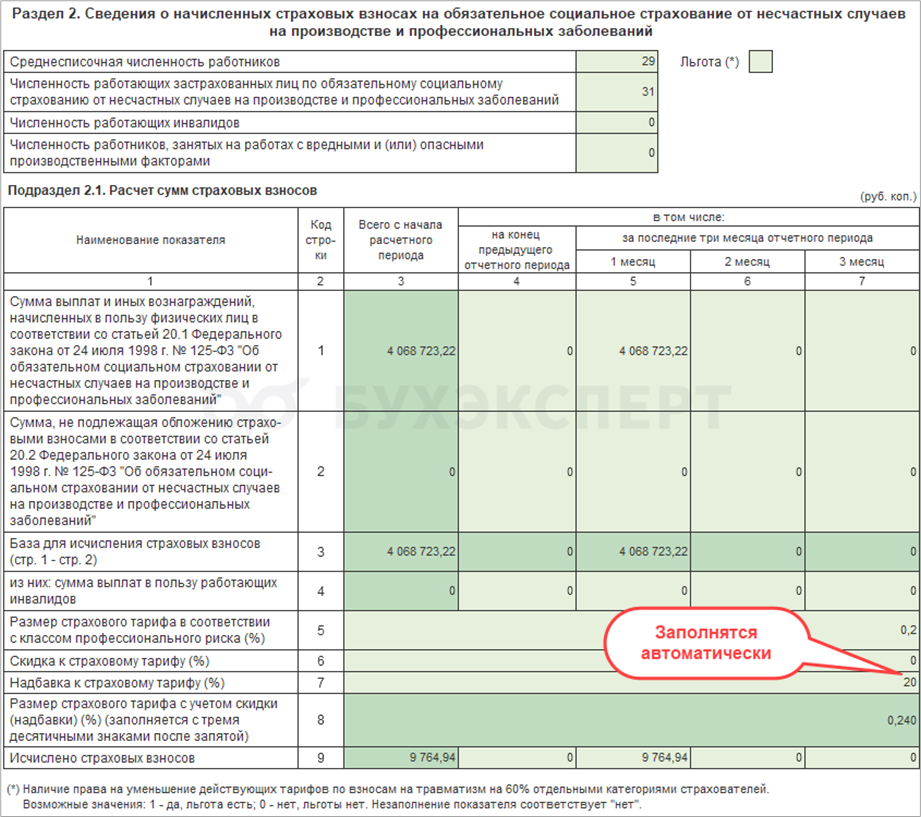 - Заполняются автоматически: среднесписочная численность работников / численность застрахованных / численность инвалидов.