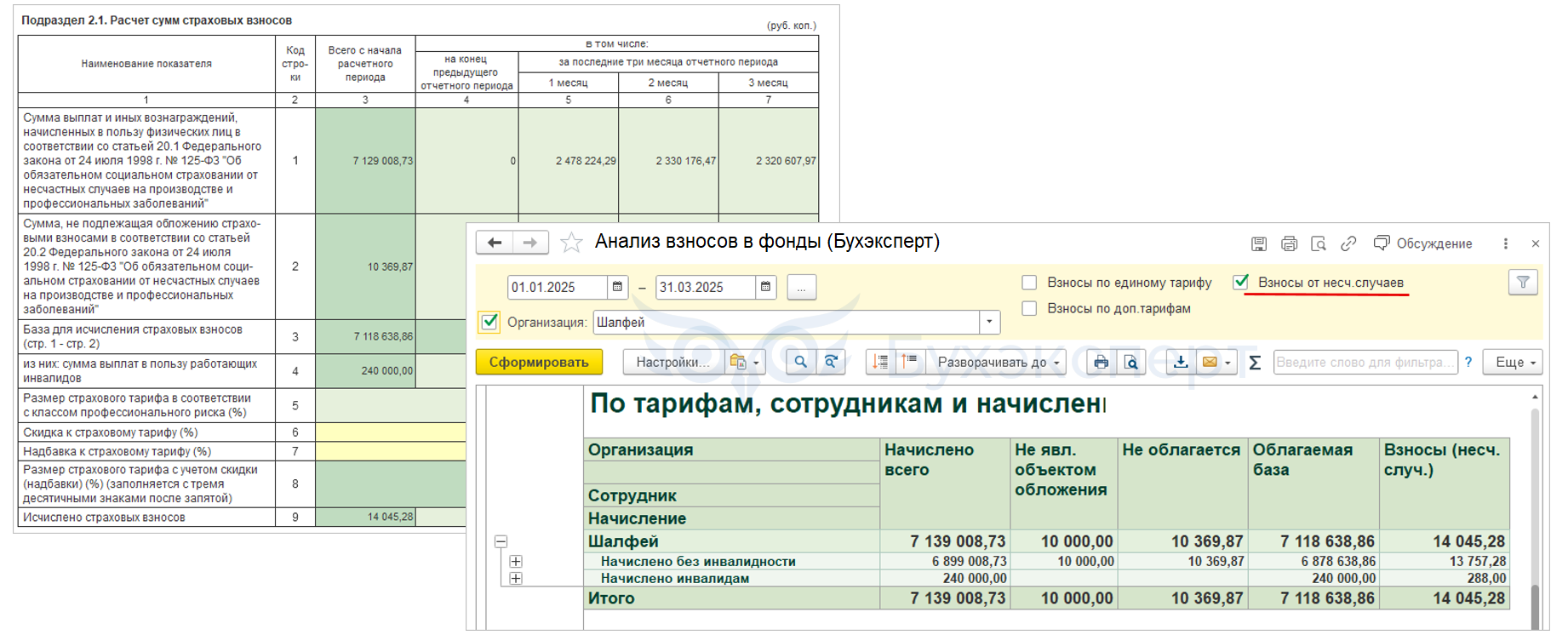 Подраздел 2.1 - проверить базу и взносы по отчету Анализ взносов в фонды: