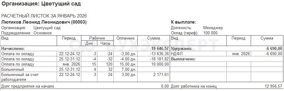 По сотруднику в январе 2026 год был зарегистрирован Больничный, который уменьшает сумму начислений за декабрь 2025. Зарплата за январь не перекрывает сторно, по итогам месяца доход сотрудника отрицательный.