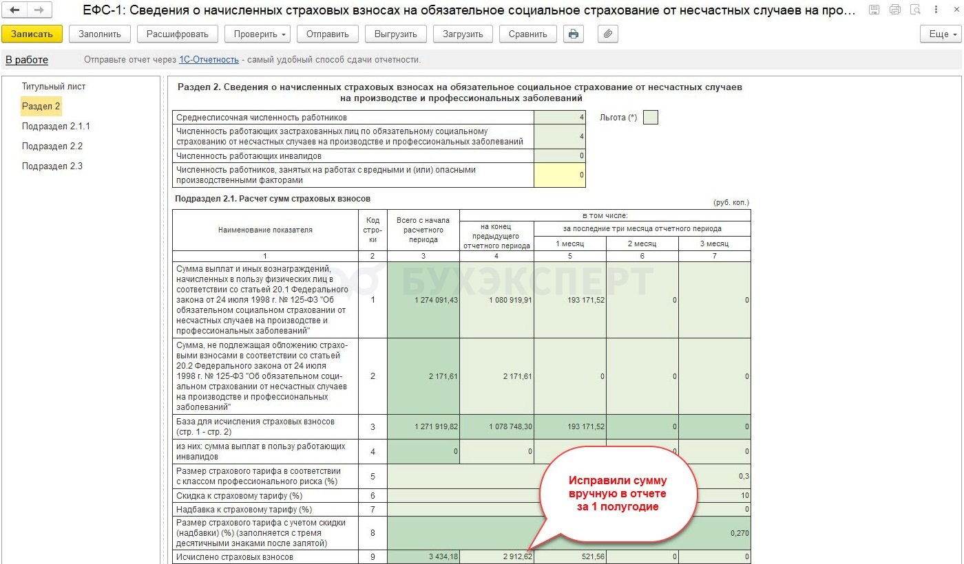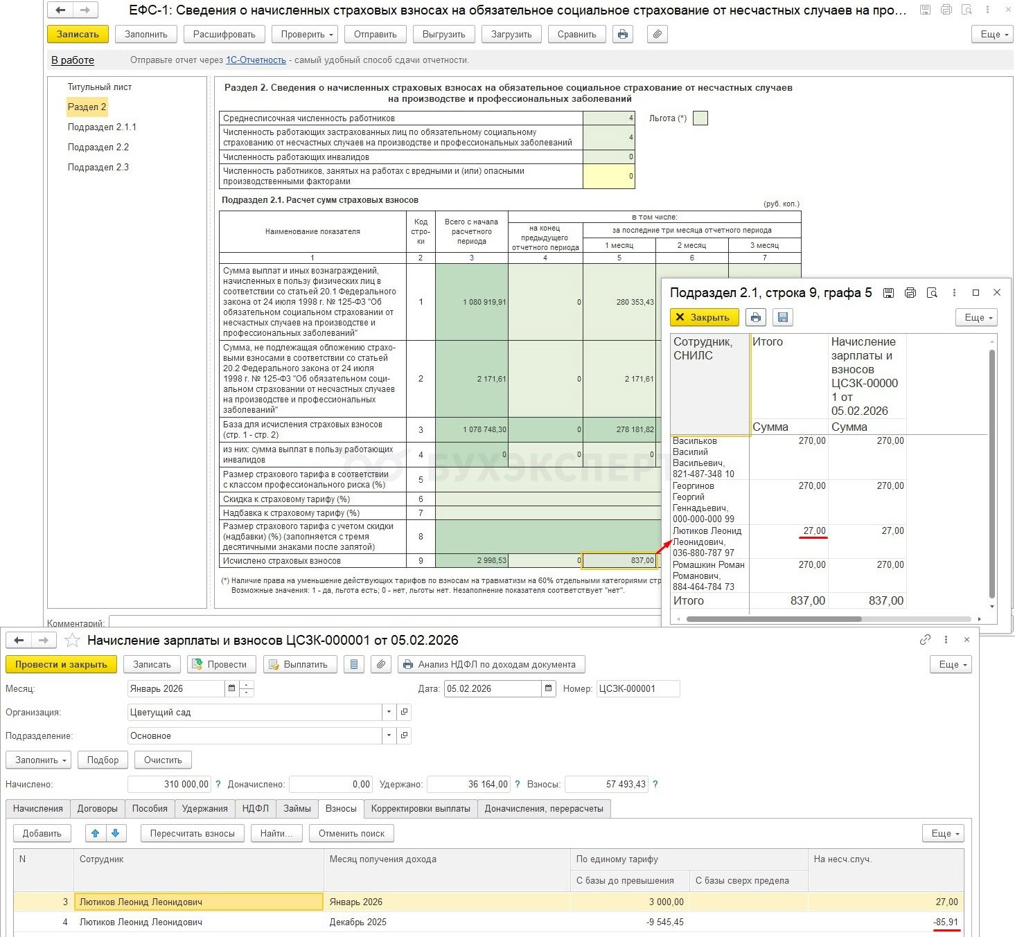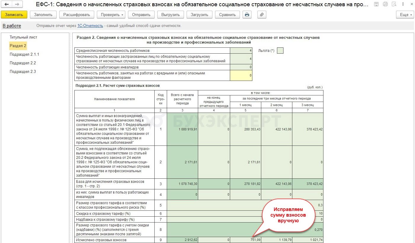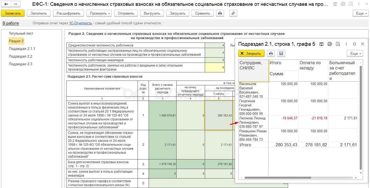 В ЗУП 3.1 есть ошибка — отрицательные суммы взносов, рассчитанные за прошлый год, не попадают в ЕФС-1 Раздел 2.
