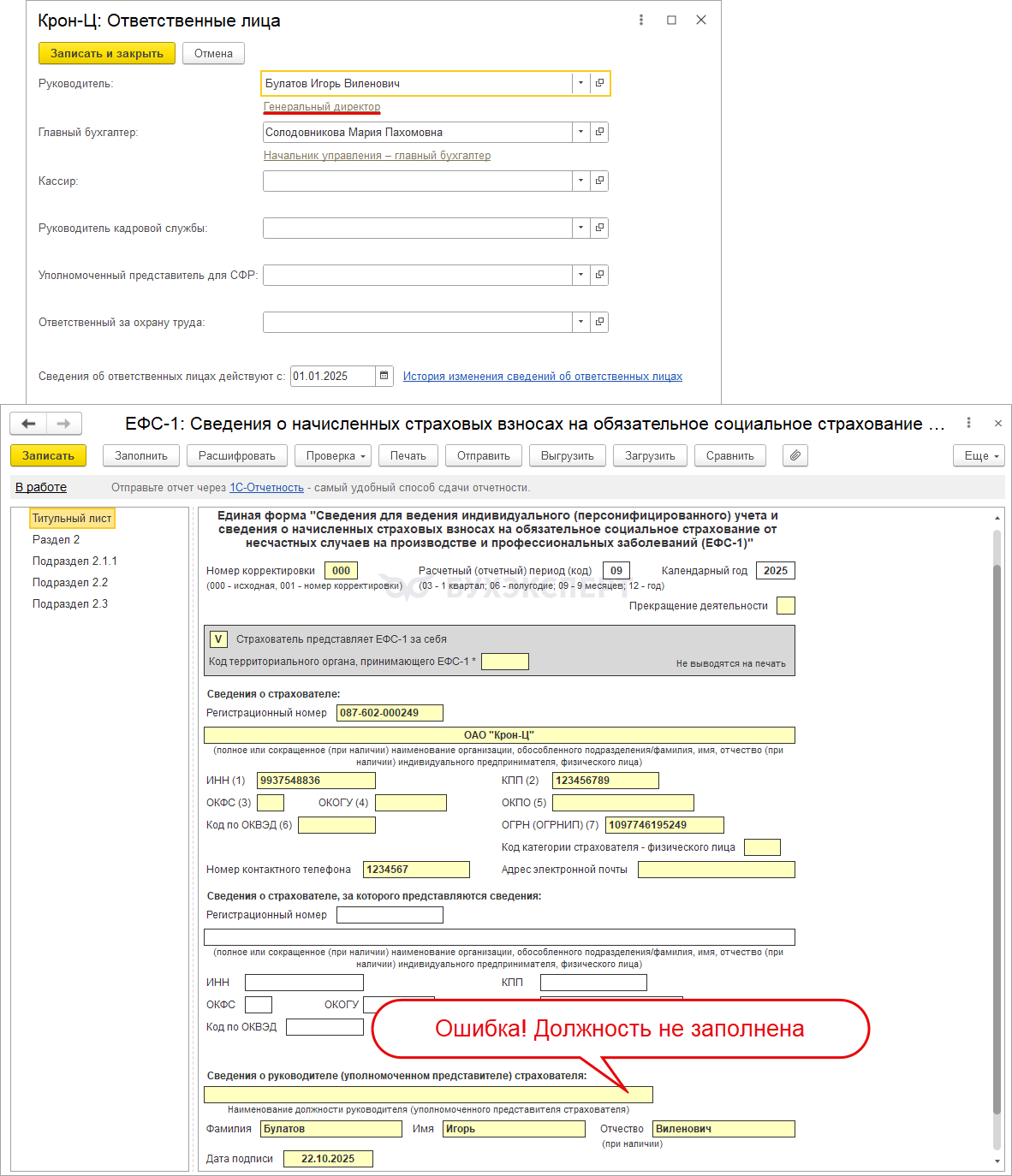 Если столкнулись с такой ошибкой, должность руководителя на Титульном листе Раздела 2 ЕФС-1 можно ввести вручную.