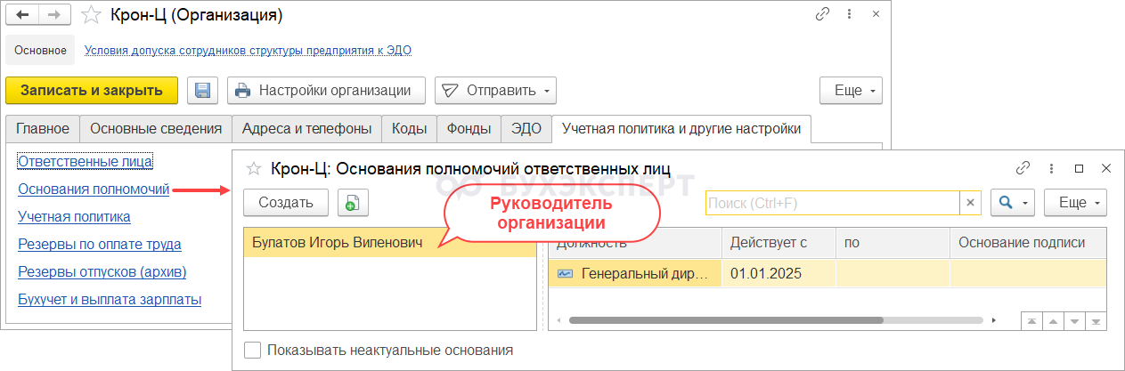 Ошибка проявляется, если используем КОРПовский функционал оснований полномочий. Он применяется, если за руководителя подписывает документы другой сотрудник. Чтобы в печатных формах документов автоматом заполнялись реквизиты доверенности такого сотрудника, назначаем его руководителе и дополнительно вводим по нему информацию об основаниях полномочий – Основания полномочий ответственных лиц (ЗУП КОРП 3.1.8).