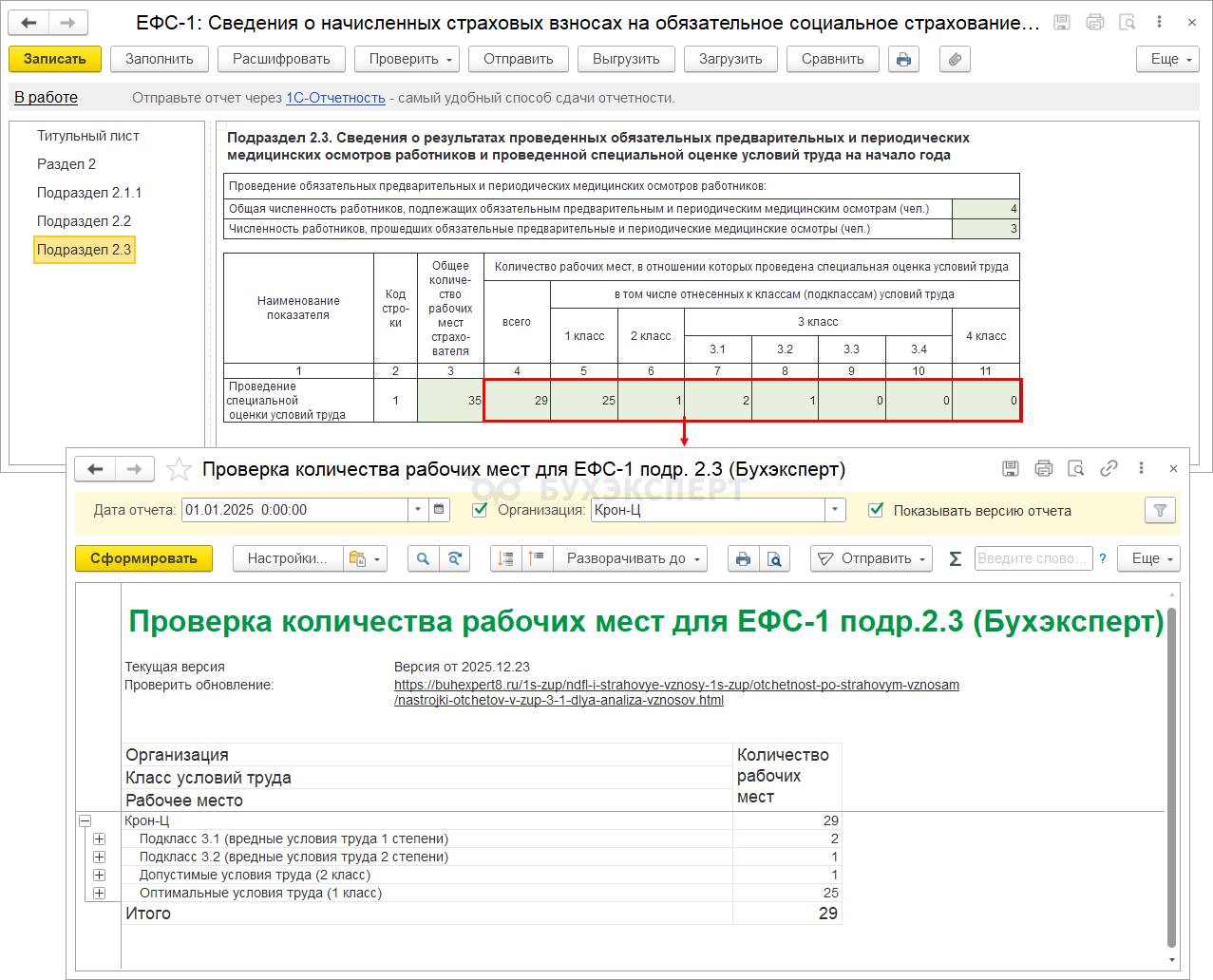 Отчет позволяет проверить в ЕФС-1 подразделе 2.3 количество рабочих мест, по которым провели специальную оценку условий труда. Данные выводятся в разрезе классов условий труда.