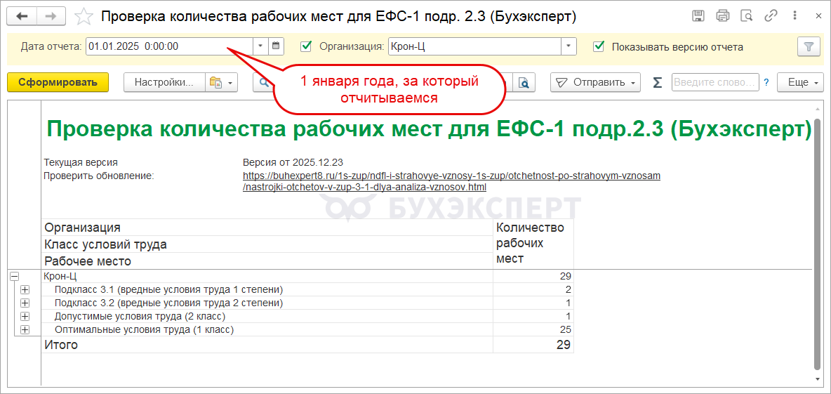 В настройках отчета в качестве Даты отчета устанавливаем первый день года, т.к. подраздел 2.3 ЕФС-1 заполняется по состоянию на 1 января расчетного периода.