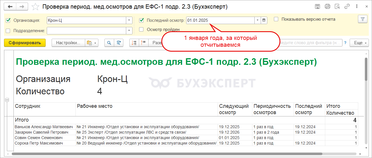 В качестве даты Последнего осмотра в настройках отчета нужно указать первый день года, за который проверяем ЕФС-1.
