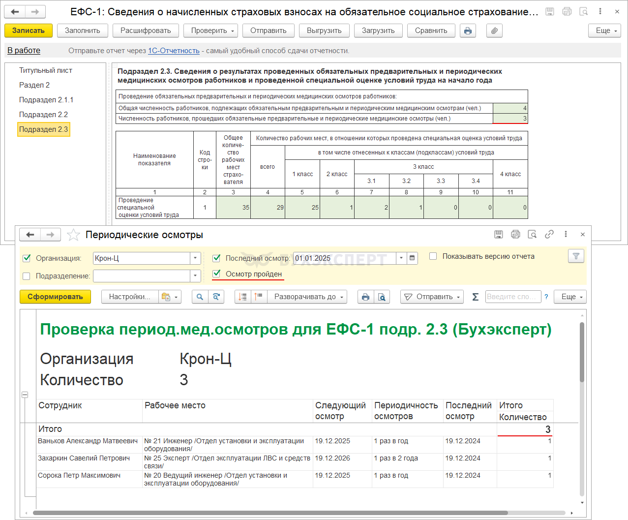 Это донастроенный отчет для ЗУП КОРП на базе отчета Периодические осмотры (Охрана труда – Отчеты по охране труда). Он позволяет проверить в Подразделе 2.3 ЕФС-1 численность работников, подлежащих медосмотрам, и прошедших периодические медицинские осмотры.