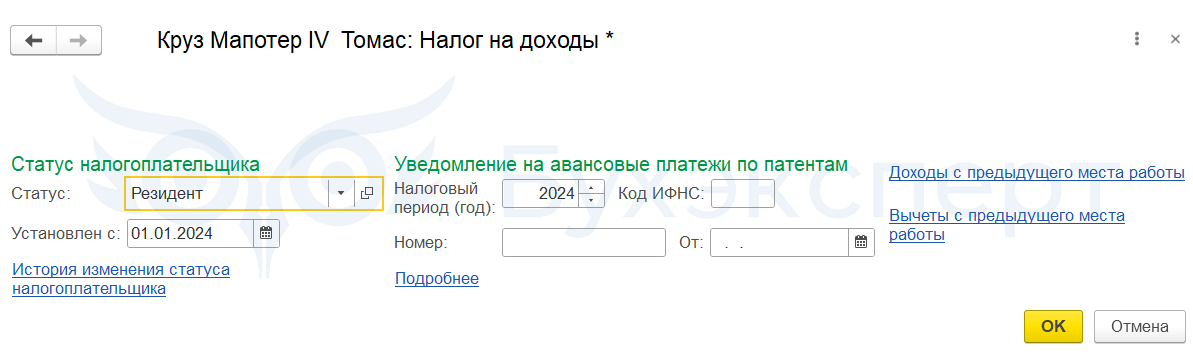 Изменим налоговый статус сотрудника с начала года.