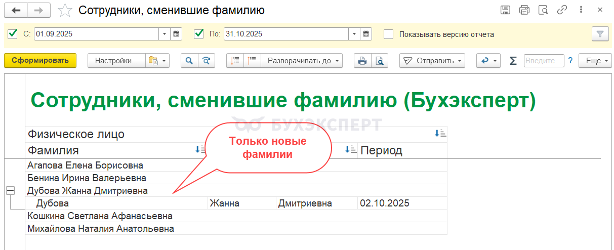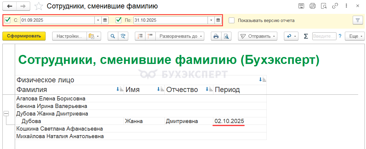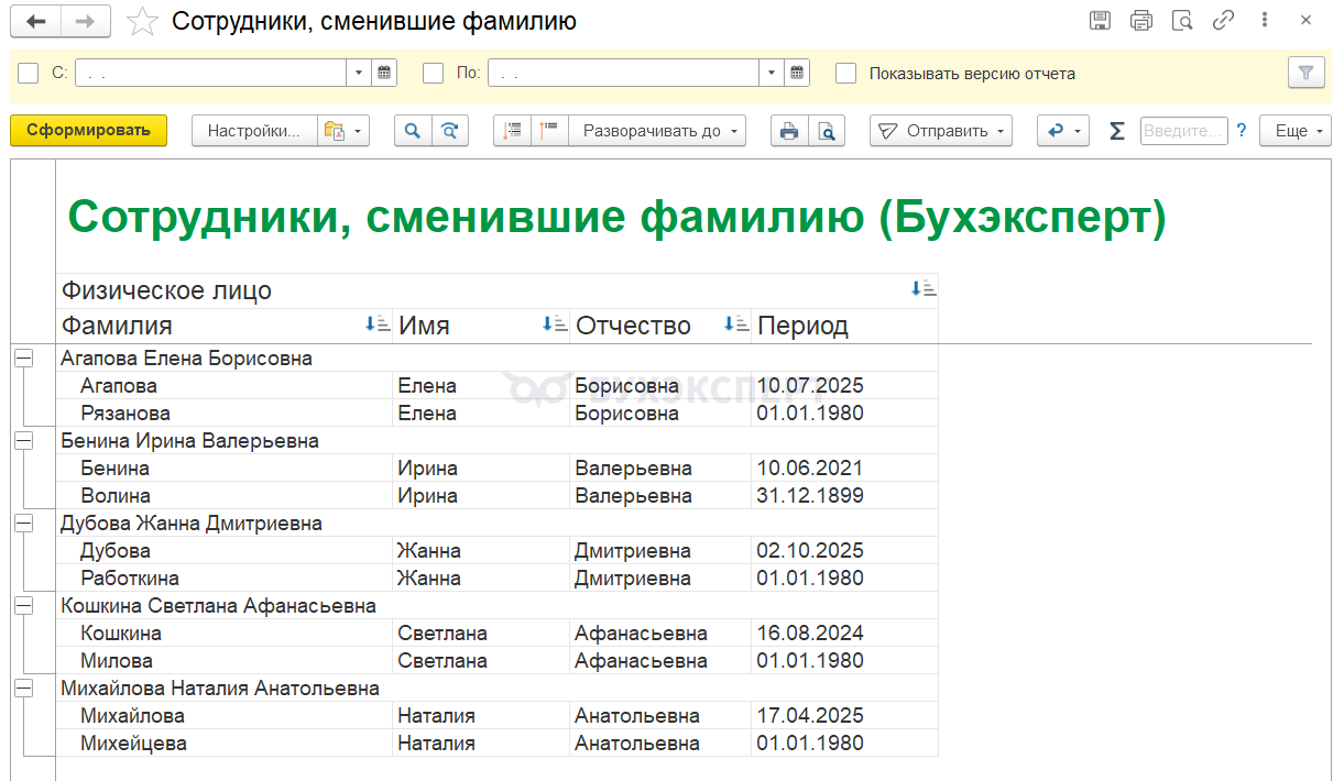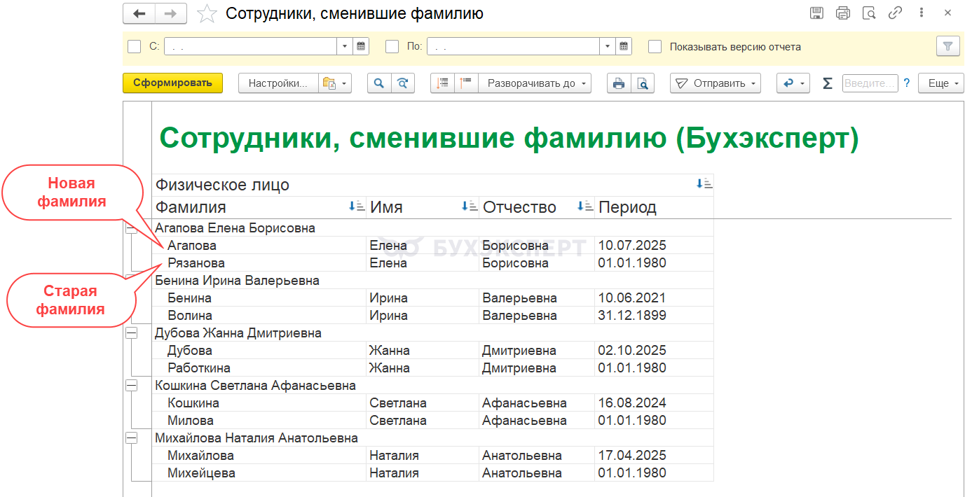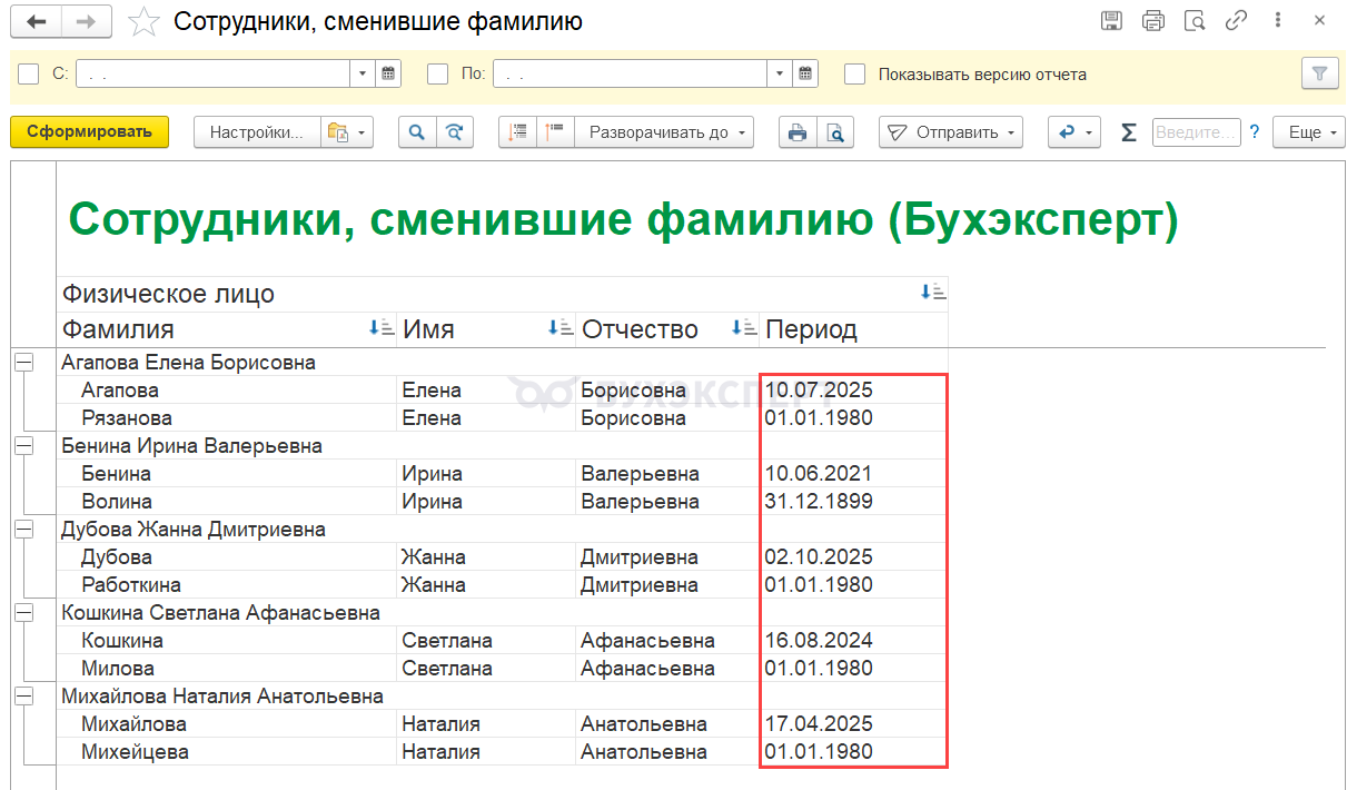 Если период заполнен, тогда в отчет также попадают все сотрудники, менявшие фамилию. Но колонка Период заполняется только по тем, у кого дата изменения фамилии приходится на период, указанный в шапке отчета.