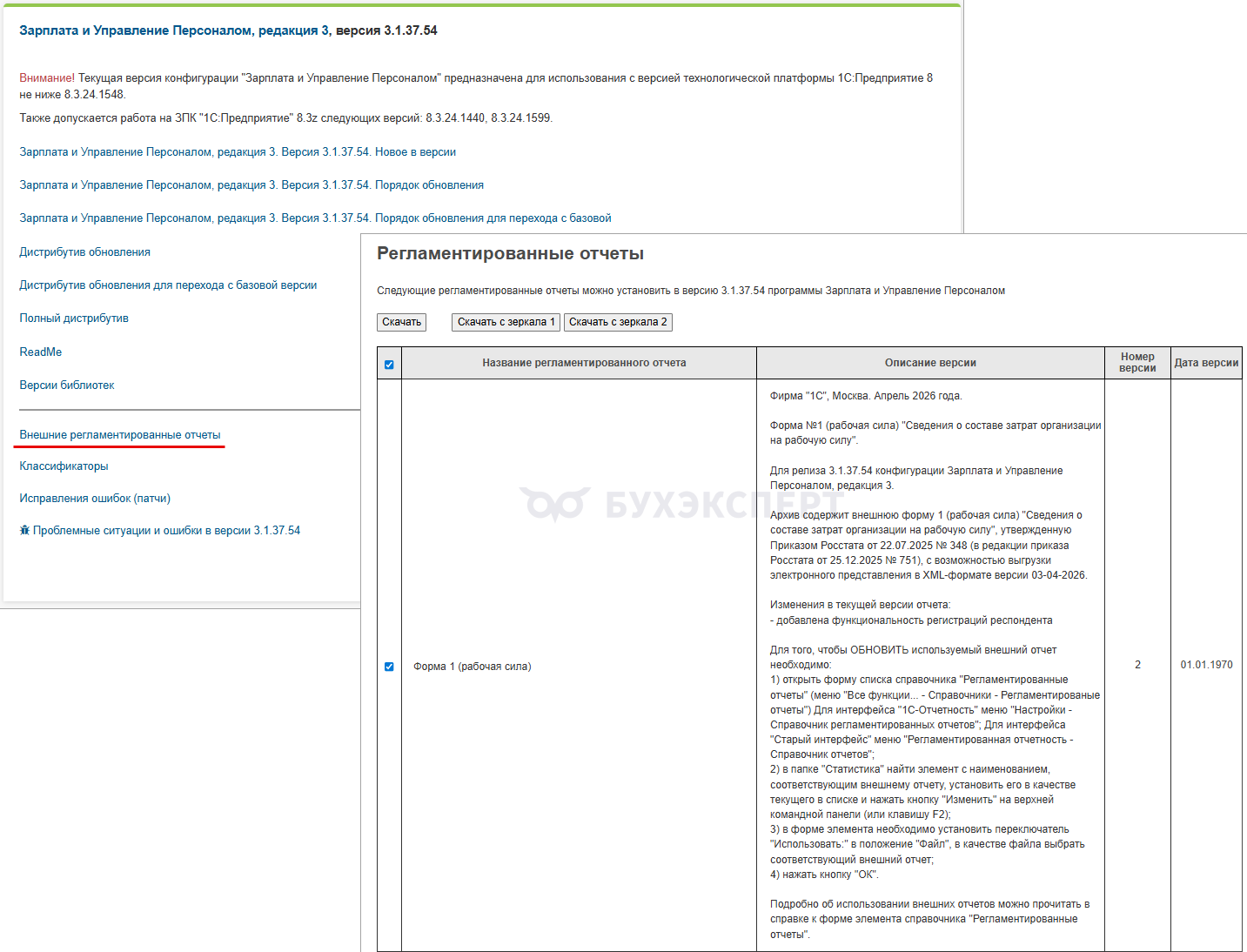 Если отчет не загрузился автоматически, проверить доступность внешнего отчета и скачать его шаблон можно на странице своего релиза ЗУП 3.1 на сайте 1С:Обновление программ