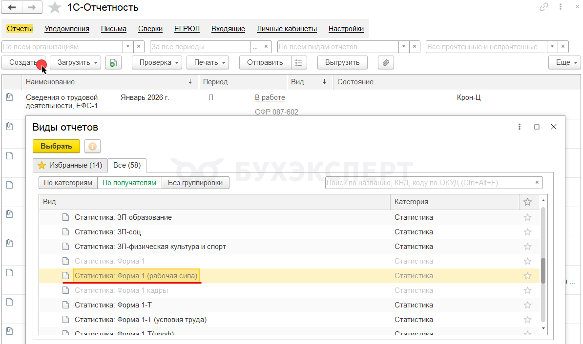 Возможность сформировать отчет появилась в программе в марте 2026 года - Форма N 1 (рабочая сила) (ЗУП 3.1.34.228 / 3.1.37.14).