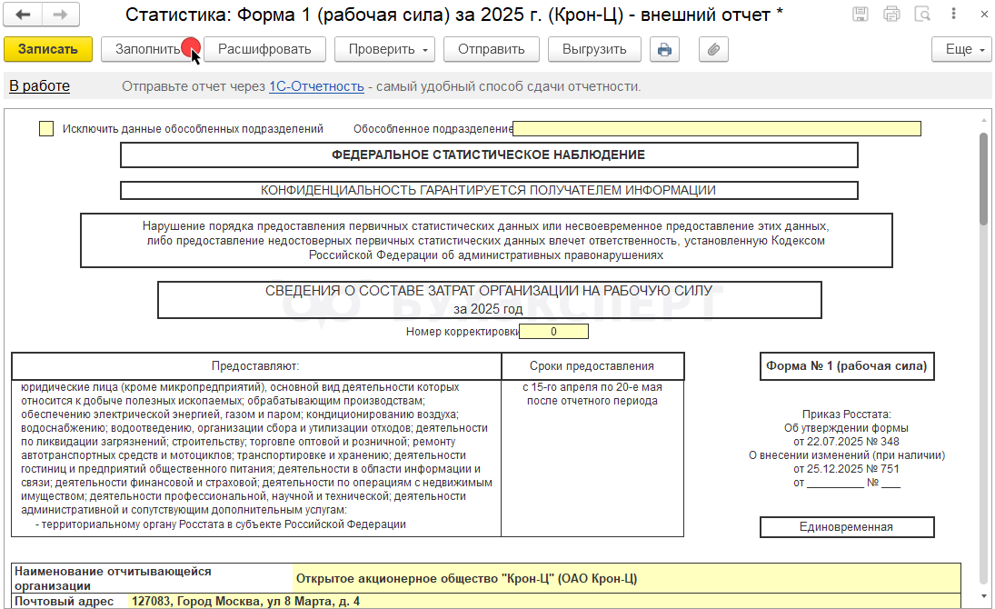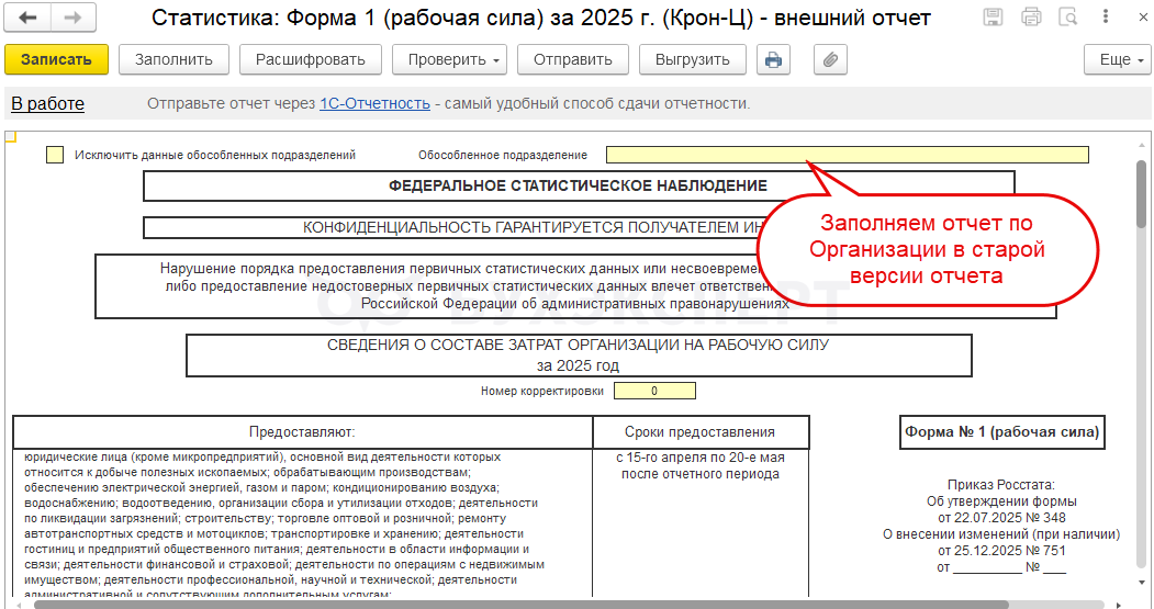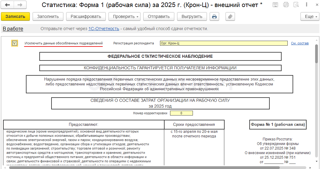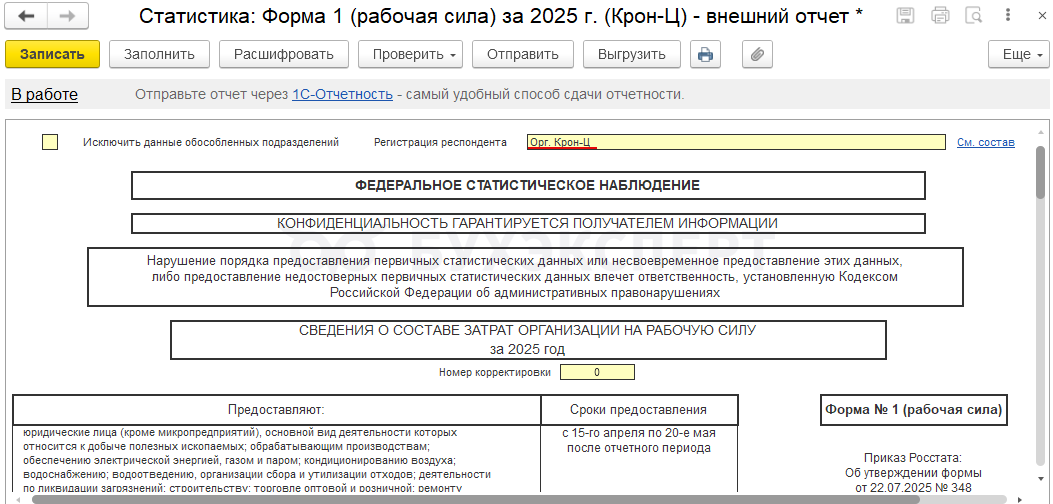 Чтобы после обновления внешнего отчета появилась возможность заполнения по выбранной регистрации в Росстате, потребуется сформировать новый экземпляр Формы 1.