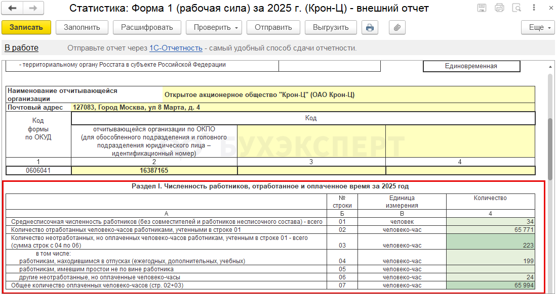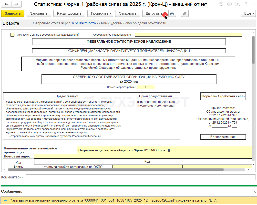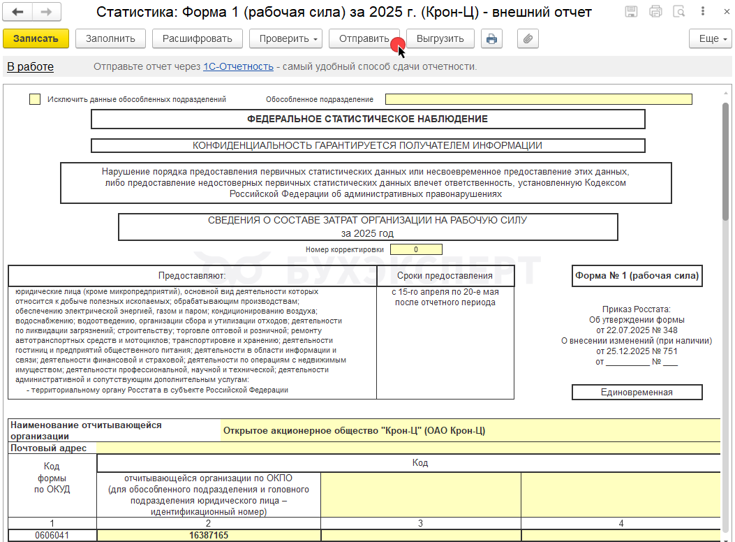 После успешной проверки отправляем отчет через сервис 1С-Отчетность по кнопке Отправить.