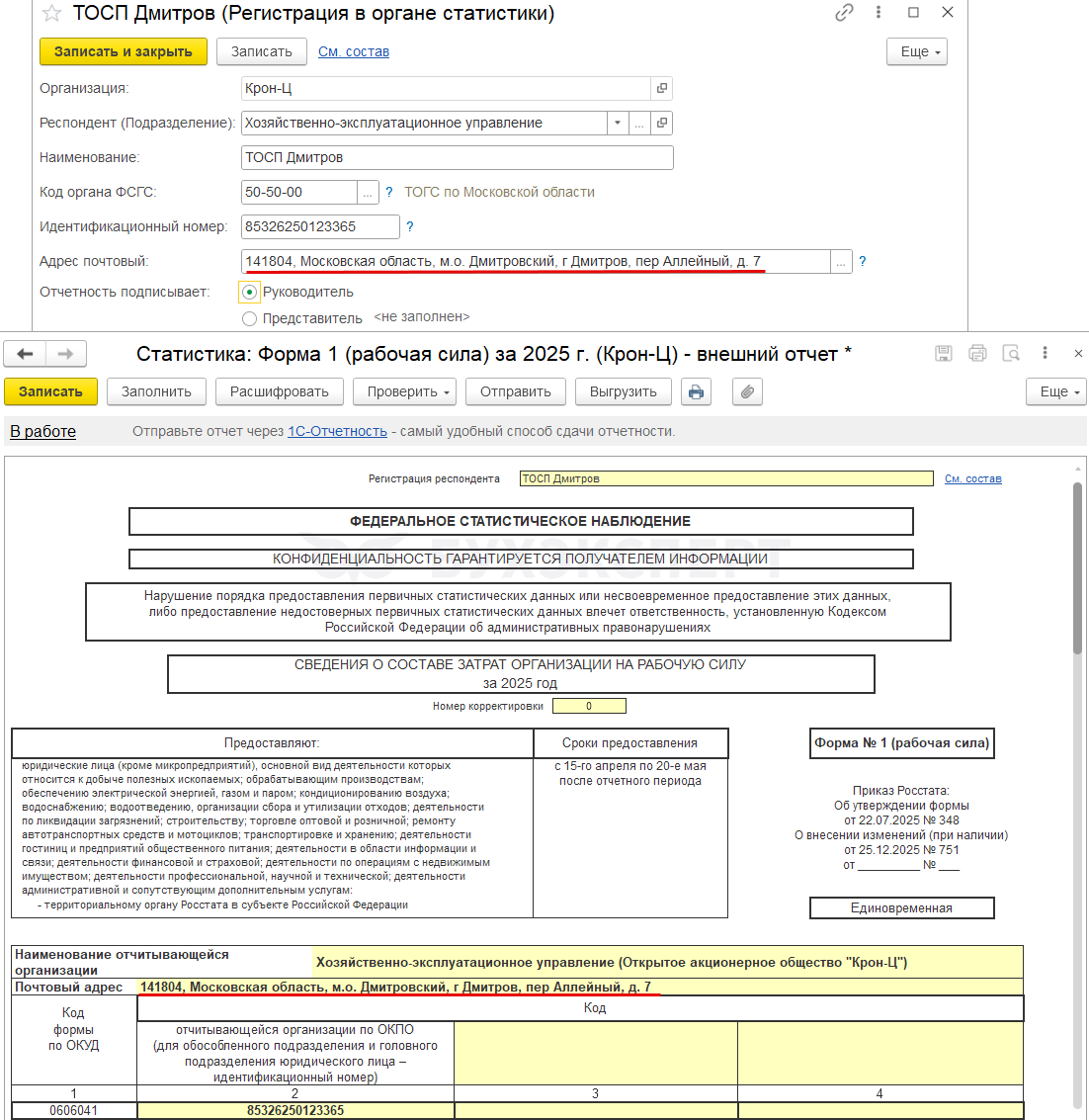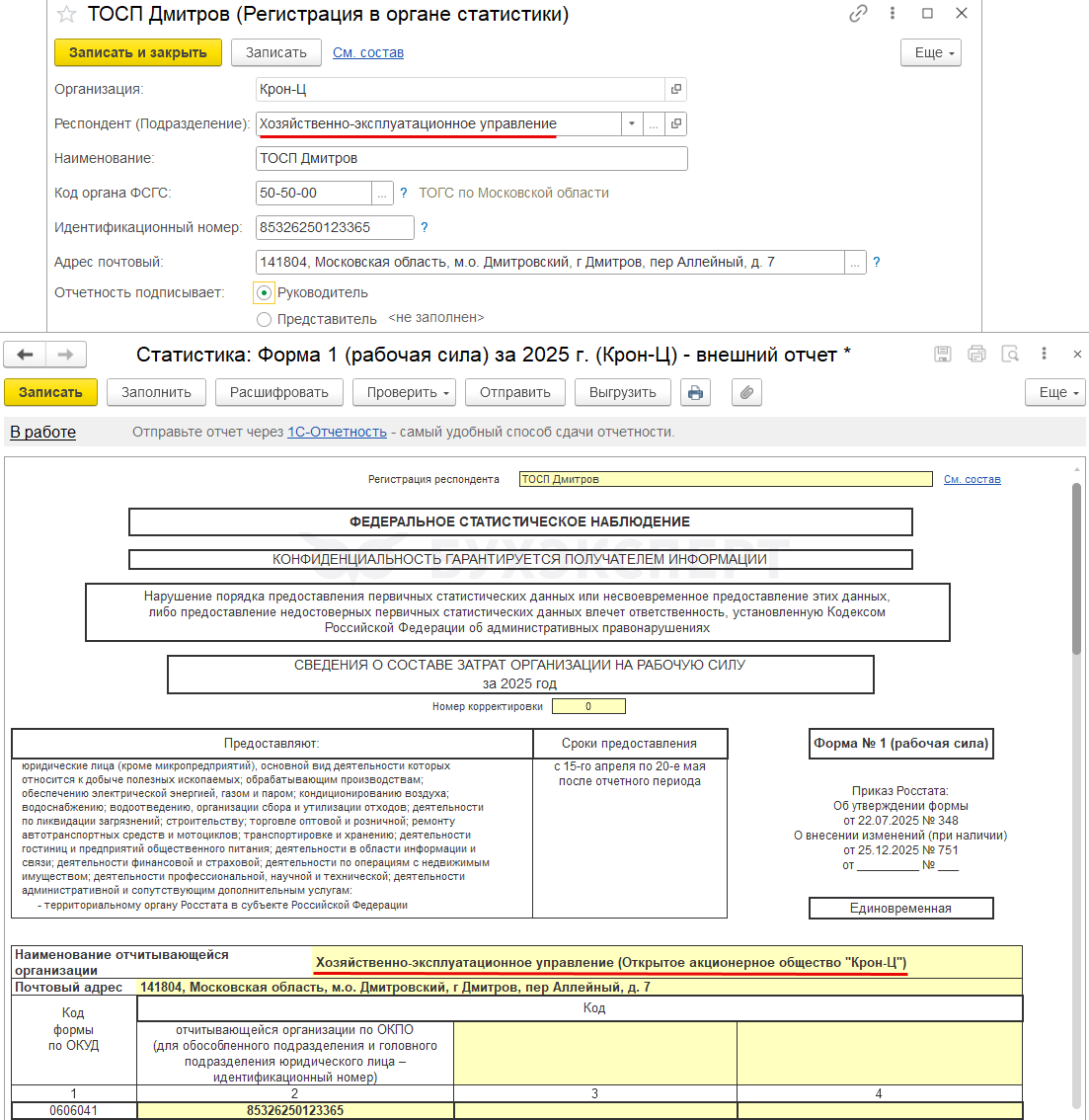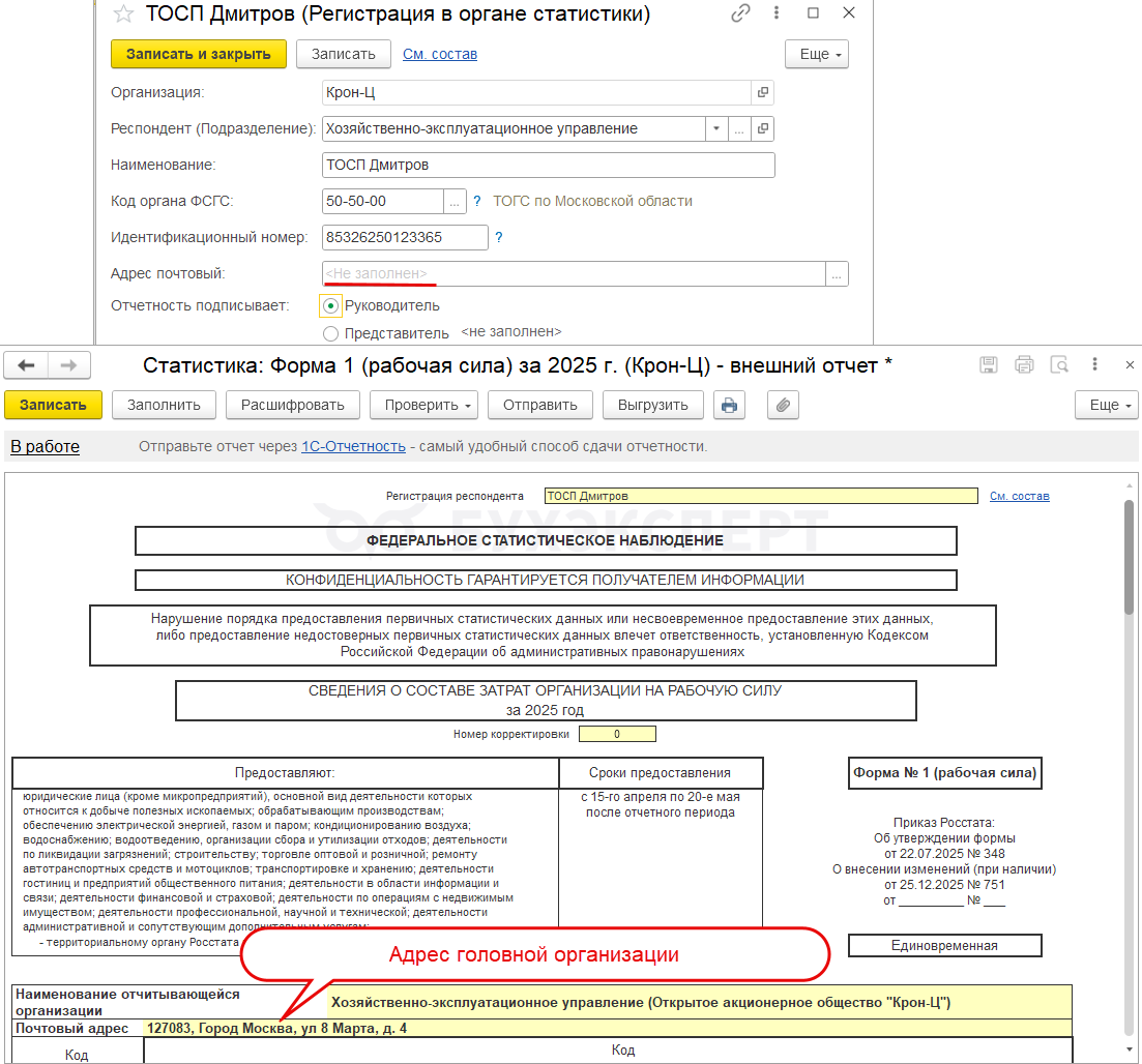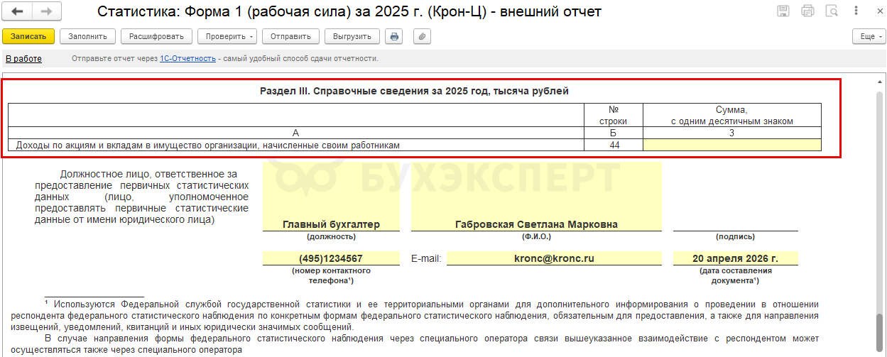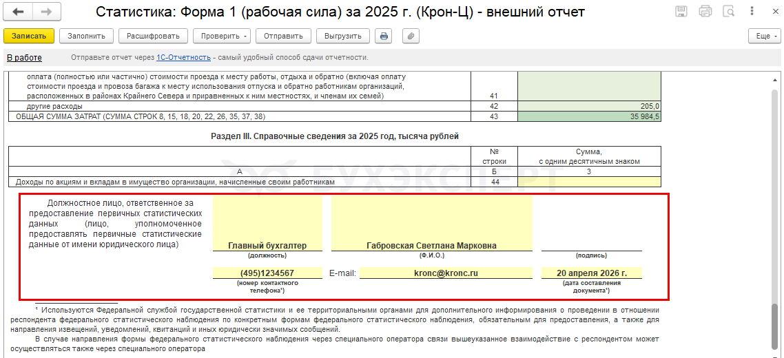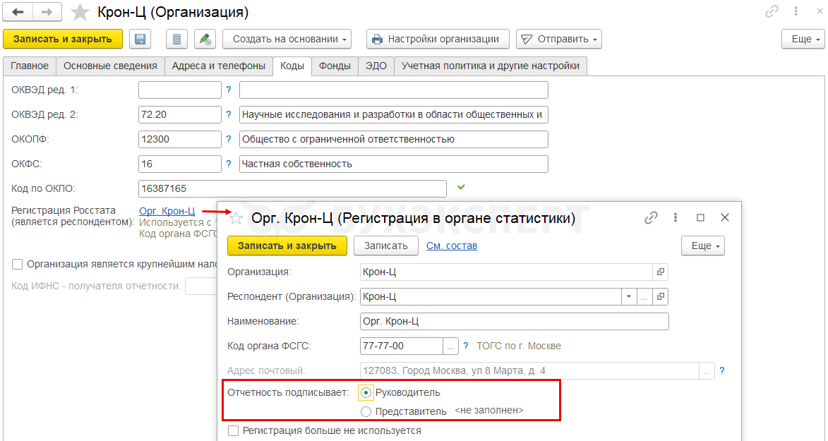 Данные о подписанте отчета заполняются по настройкам из Регистрации в органе статистики в карточке Организации или Подразделения.