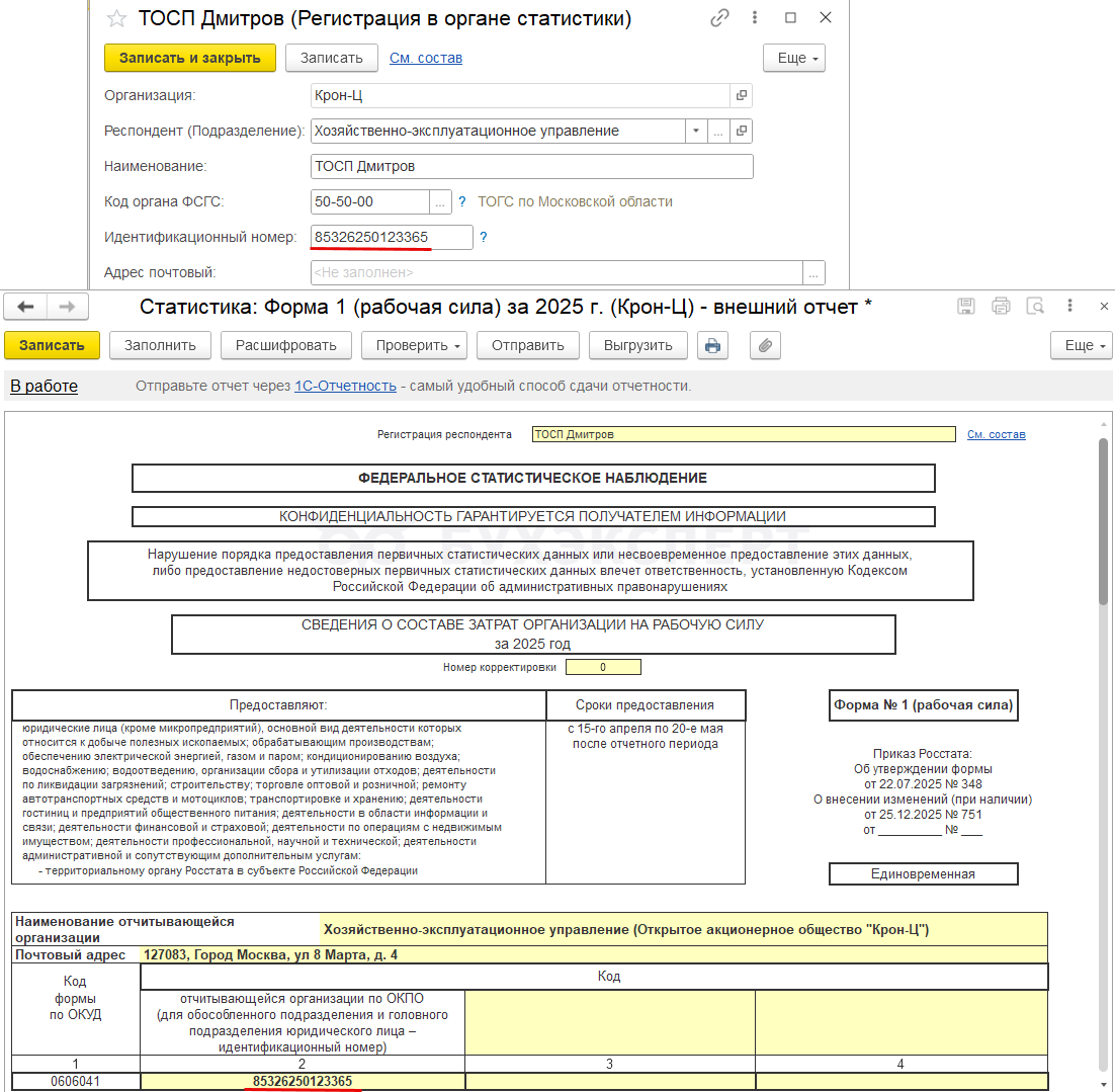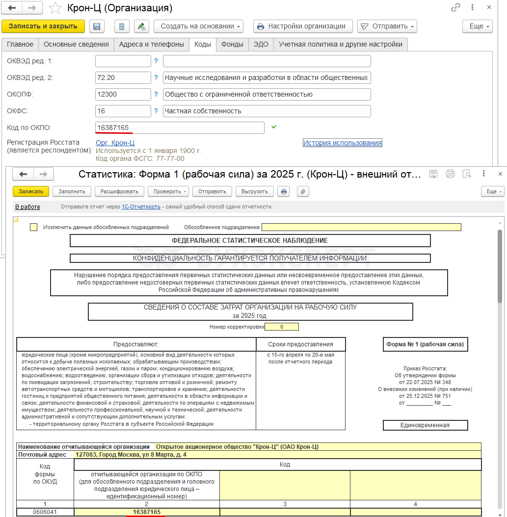 • Код по ОКПО программа берет из поля Идентификационный номер в карточке Регистрации в Росстате
