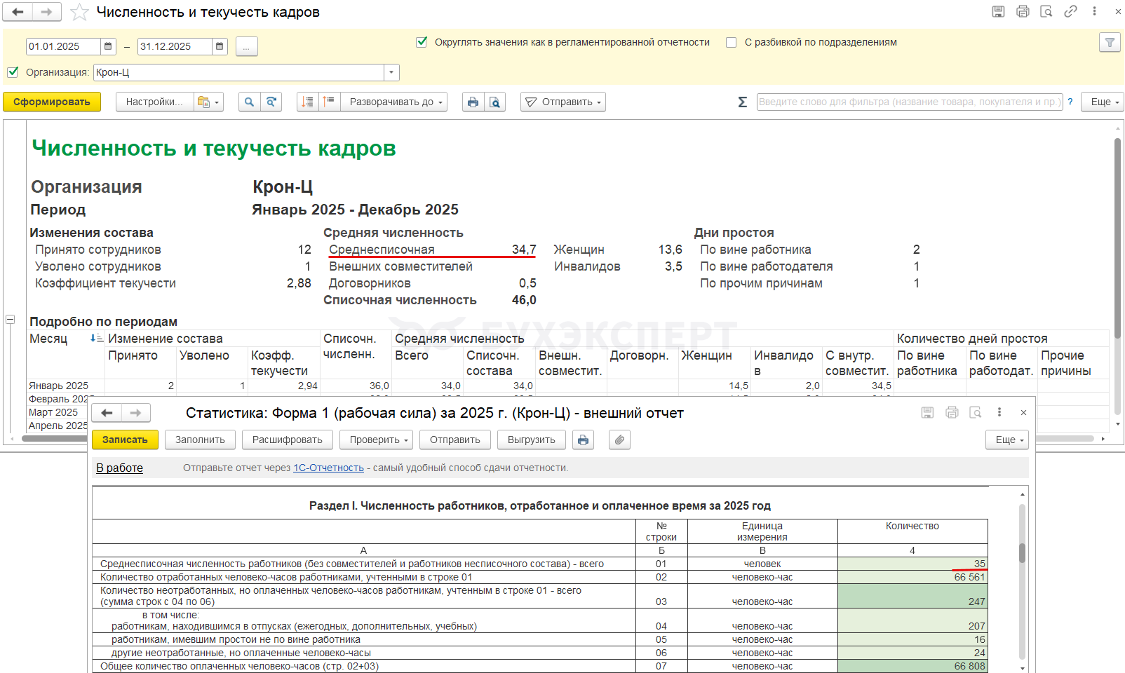 Для проверки численности по организации подойдет типовой отчет Численность и текучесть кадров (Кадры – Кадровые отчеты).